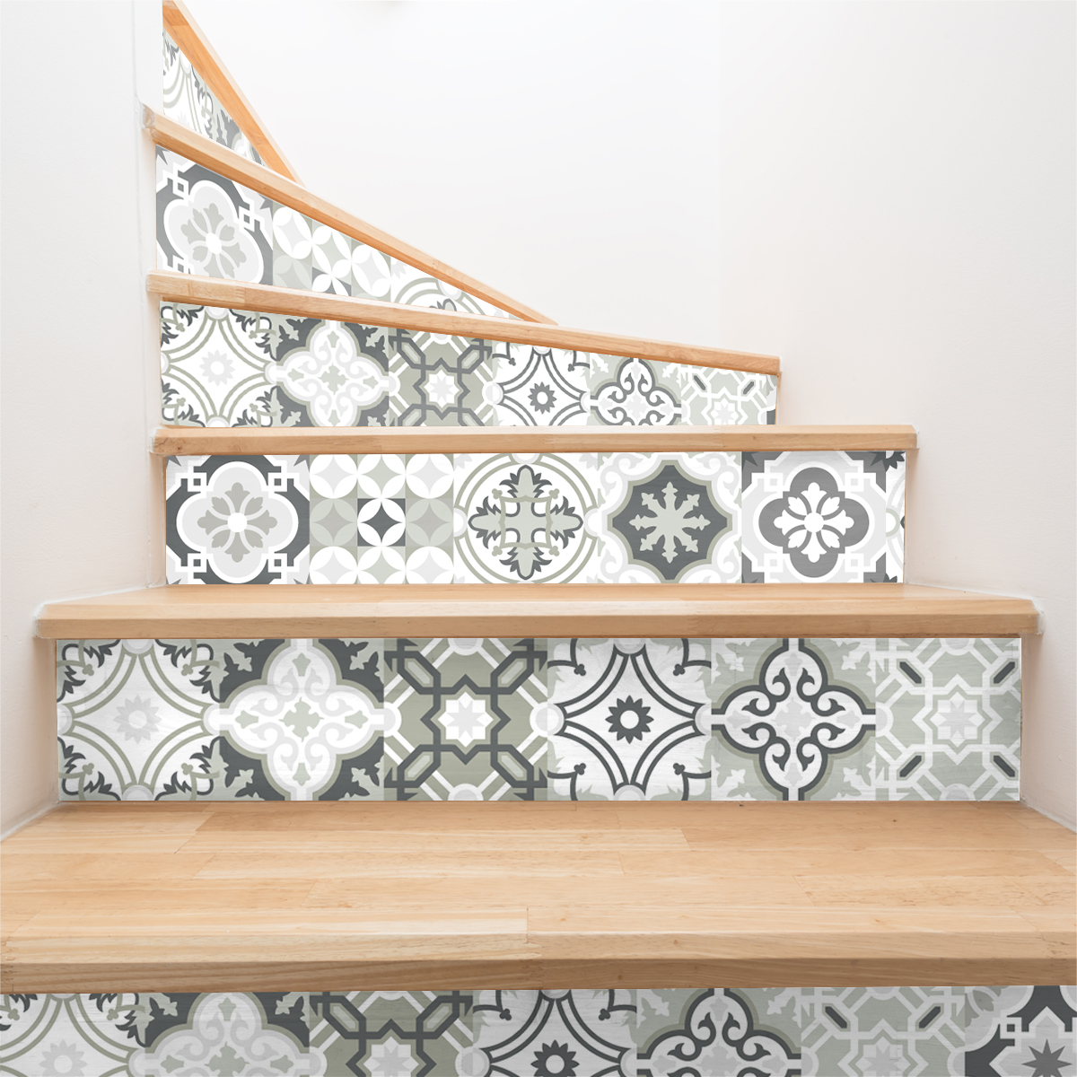 | Libellé | Stickers adhésifs escalier carrelages | Sticker Autocollant contremarche Carreaux de ciment carrelages adhésif - NUANCES DE VERT GRIS OSLO |