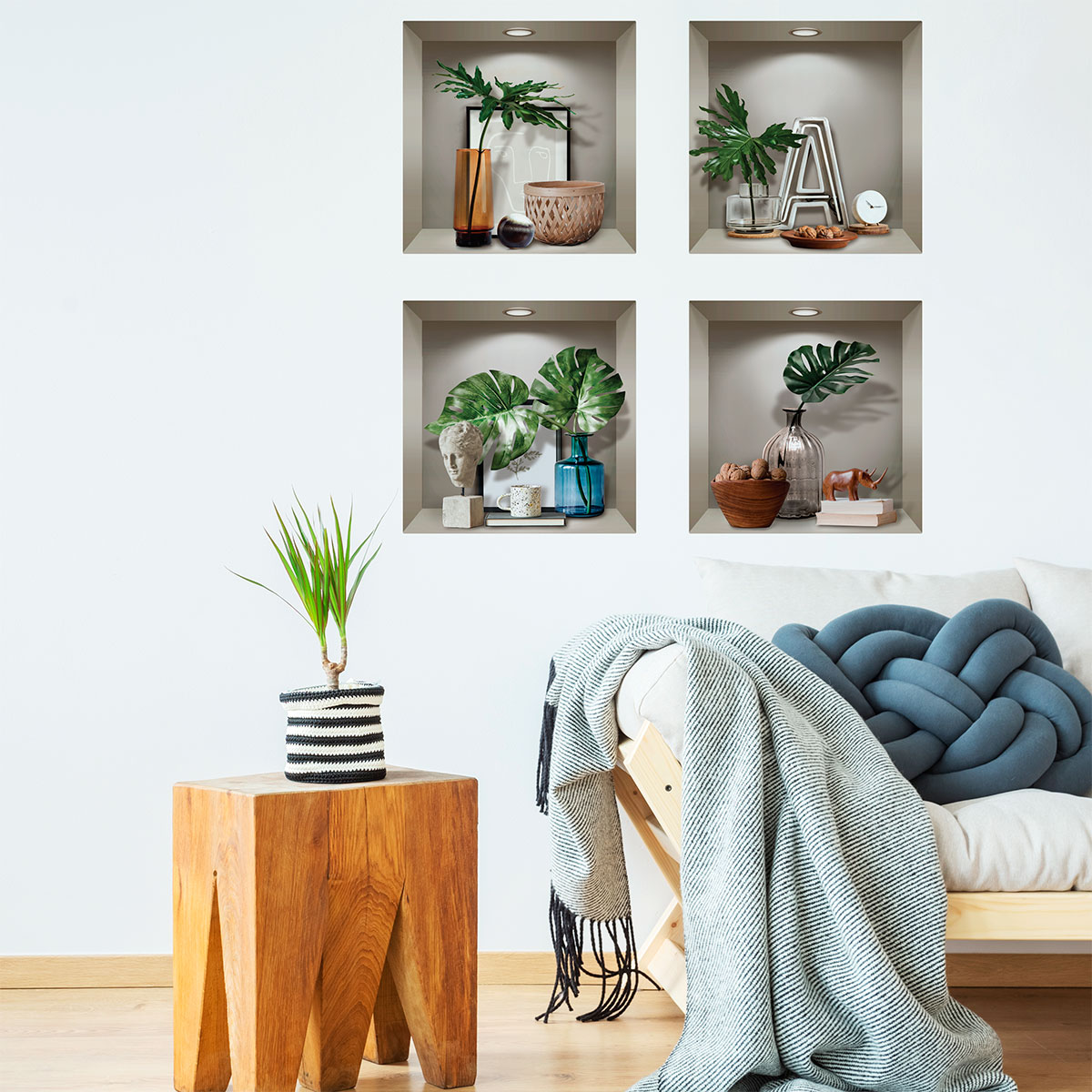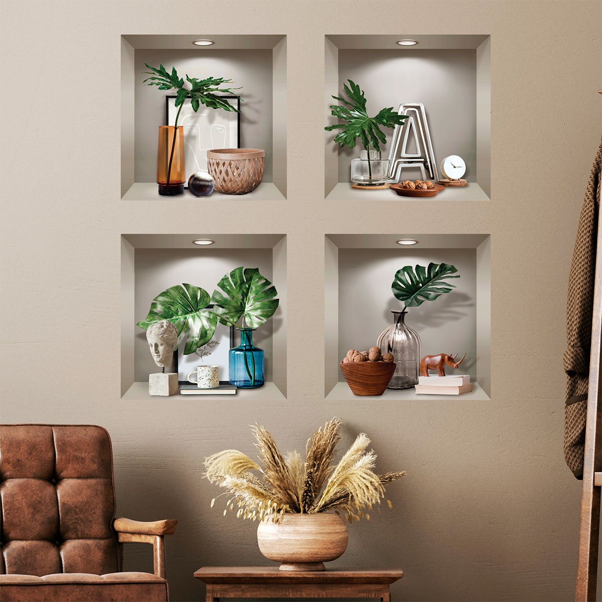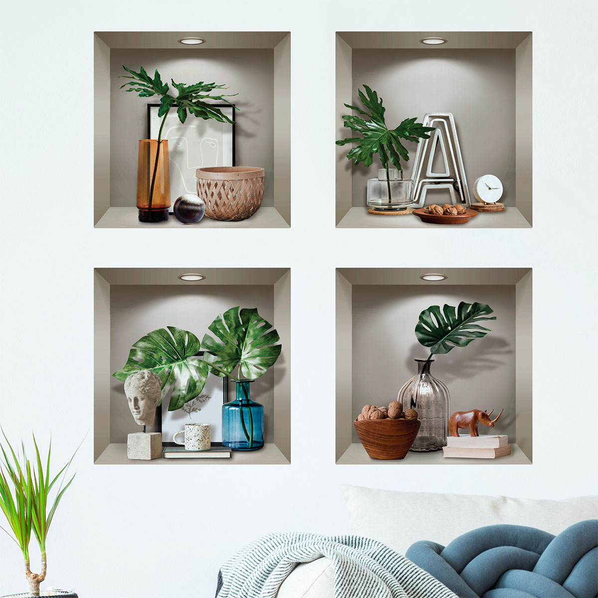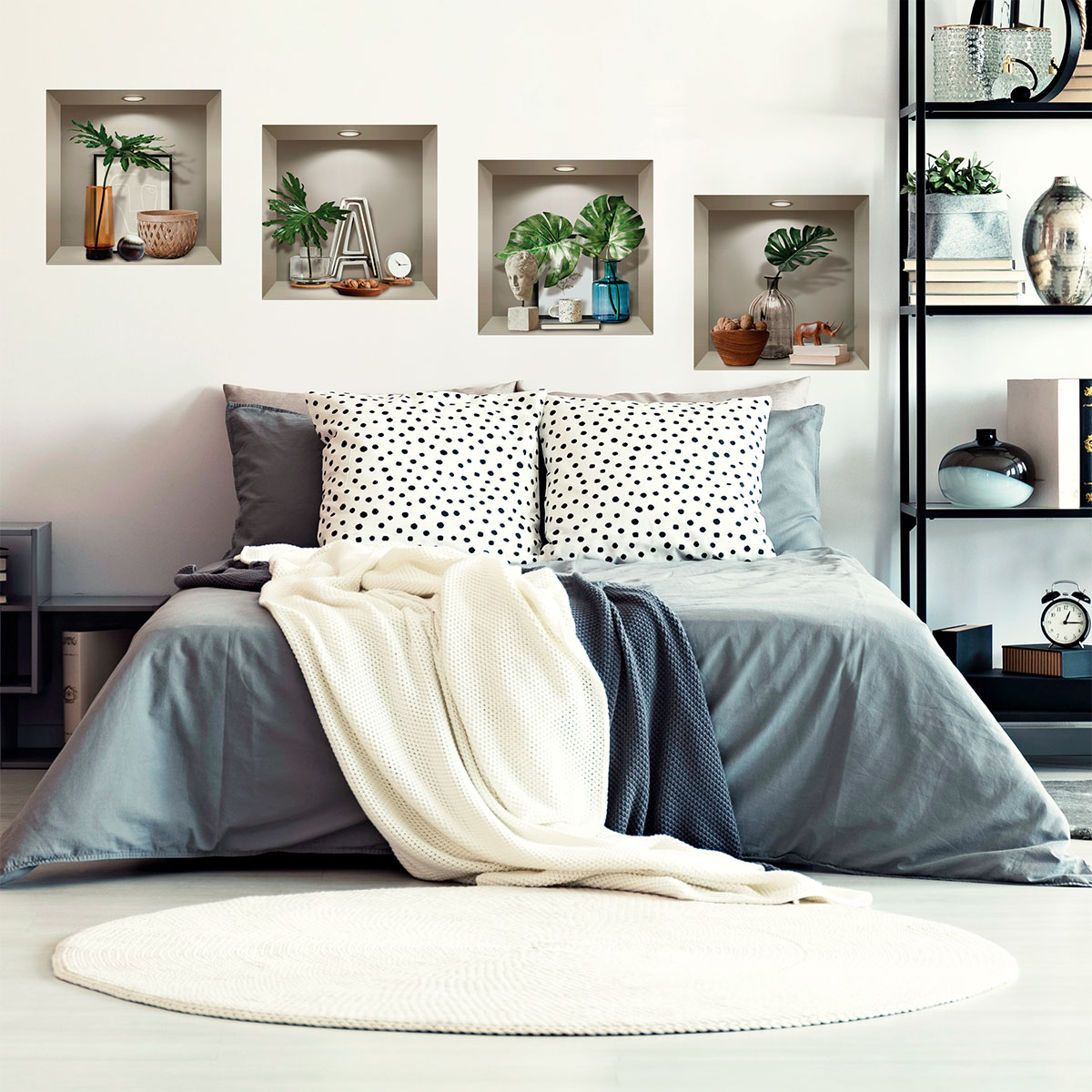 Des stickers 3D pour votre déco ! Avec ce magnifique sticker 3D représentant des Stickers effet 3D plantes et objets design 60 x 60 cm, vous allez pouvoir décorer l'intérieur de votre chez vous de manière simple et authentique ! Plongez-vous dans une toute autre atmosphère sans sortir de chez vous ! Où coller cet autocollant déco ? Cet adhésif 3D déco sera parfait pour décorer l'intérieur toutes les pièces de vie de votre intérieur ! Épatez vos convives avec nos visuels originaux ! Dimension des stickers niches 3D : Pour le H60 x L60 cm, le sticker se compose de 4 stickers niches 3D qui mesurent H30 x L30 cm Impression numérique en haute définition sur du vinyle autocollant 3D de qualité supérieure. La grande épaisseur du sticker 3D permet une pose aisée. Décollez cet adhésif mural 3D de son support et appliquez-le de gauche à droite. Un repositionnement est possible durant les premiers mois. Le sticker 3D tient ensuite durablement sur votre support, sans l'abîmer lors du décollage. Les stickers muraux 3D, c'est l'originalité garantie ! IMPORTANT : Vous avez la possibilité de disposer chaque élément du sticker mural 3D de la façon dont vous souhaitez. Ce qui donne des multiples idées pour décorer votre intérieur.