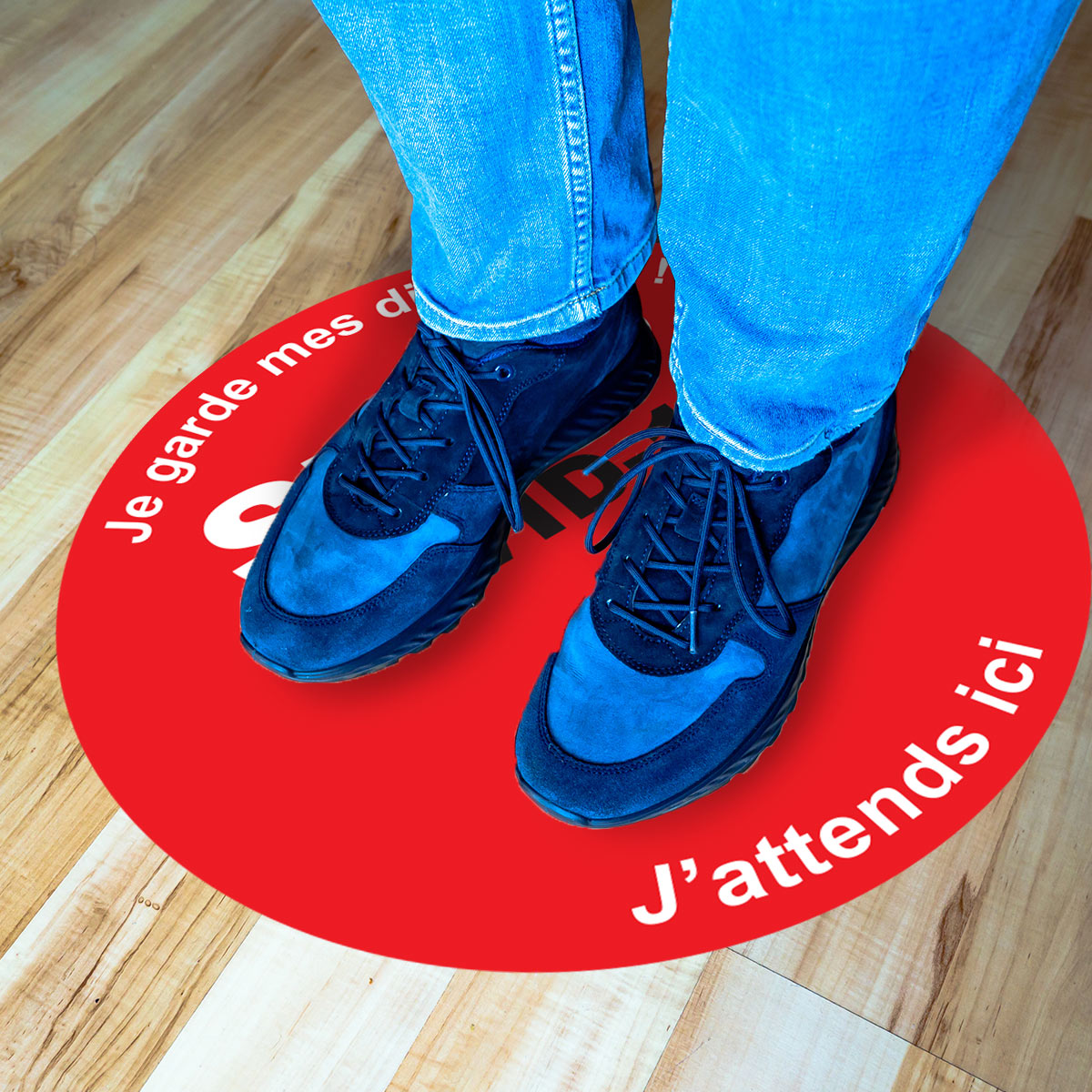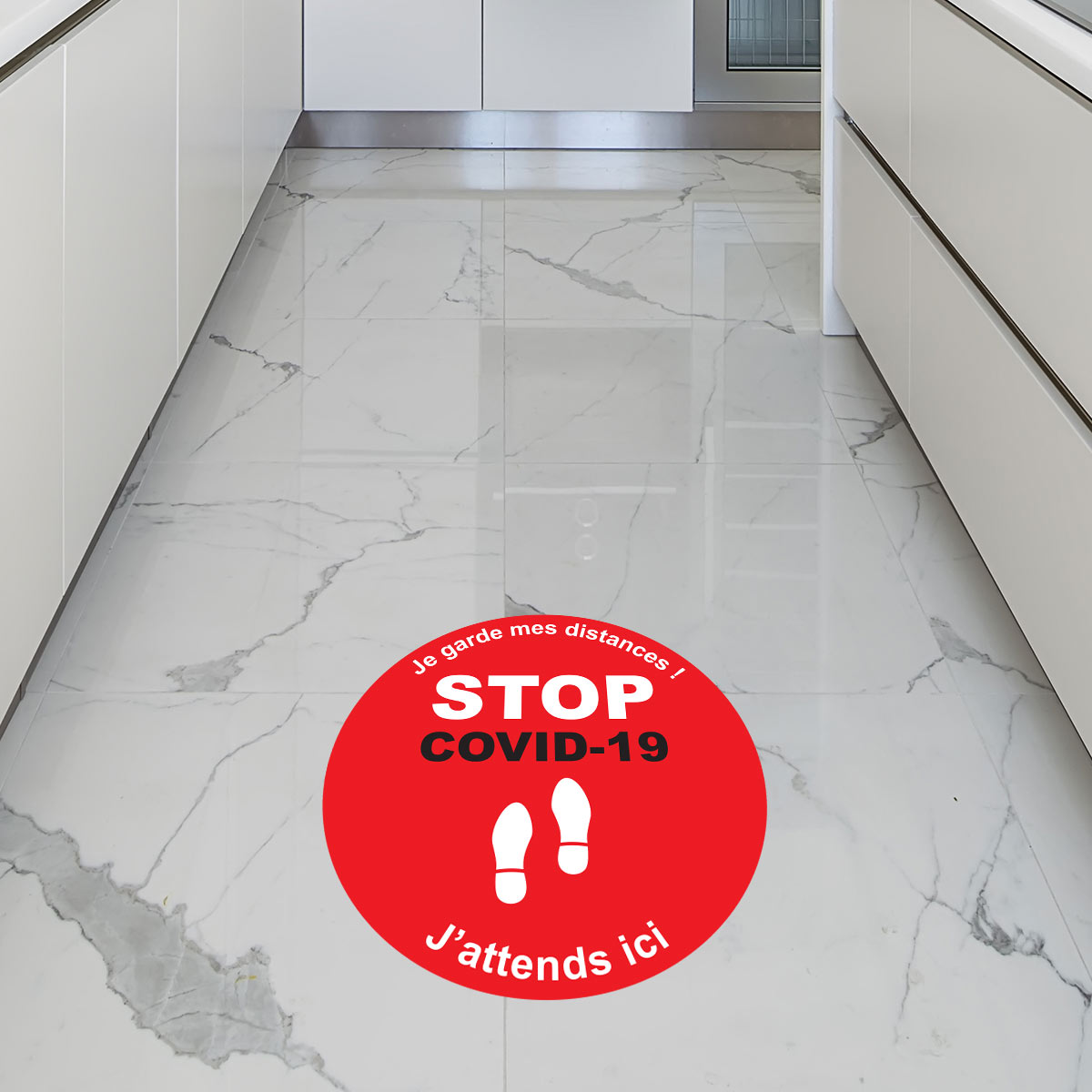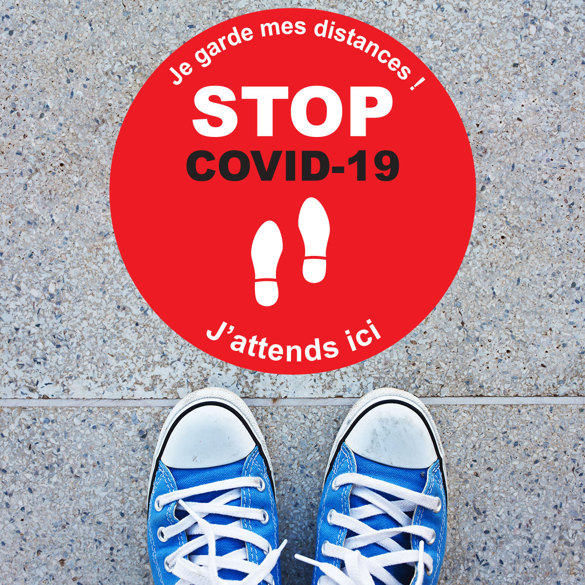 Des stickers sol covid-19 pour votre sécurité ! En cette période particulière de pandémie COVID-19, la prévention reste la principale arme pour combattre la propagation du coronavirus. Grâce à ce Stickers sol stop covid-19 50 x 50 cm, vous pourrez signaler toutes les mesures sanitaires à respecter dans les lieux publics. Description du sticker sol stop covid-19 : - Conseil de pose: Décoller le sticker de son support et l'appliquer sur un sol lisse. Facile à poser, pas de bulle d'air. - Surface plastifiée étanche et antidérapante - Résistant aux rayures et aux produits de nettoyage - Epaisseur : 0,2 mm Où coller cet autocollant déco ? Le sticker stop coronavirus s’approprie pour tous les endroits où les personnes sont amenés à se rendre : les bureaux, les hôpitaux, les magasins... Avec l’autocollant covid-19, il est essentiel de ne pas céder à la panique dans tous les lieux publics ! Les stickers covid vous permettrons d'avoir directement le réflexe de marquer la distanciation sociale. IMPORTANT : Vous avez la possibililé de placer ces stickers sol stop covid de la façon dont vous souhaitez.