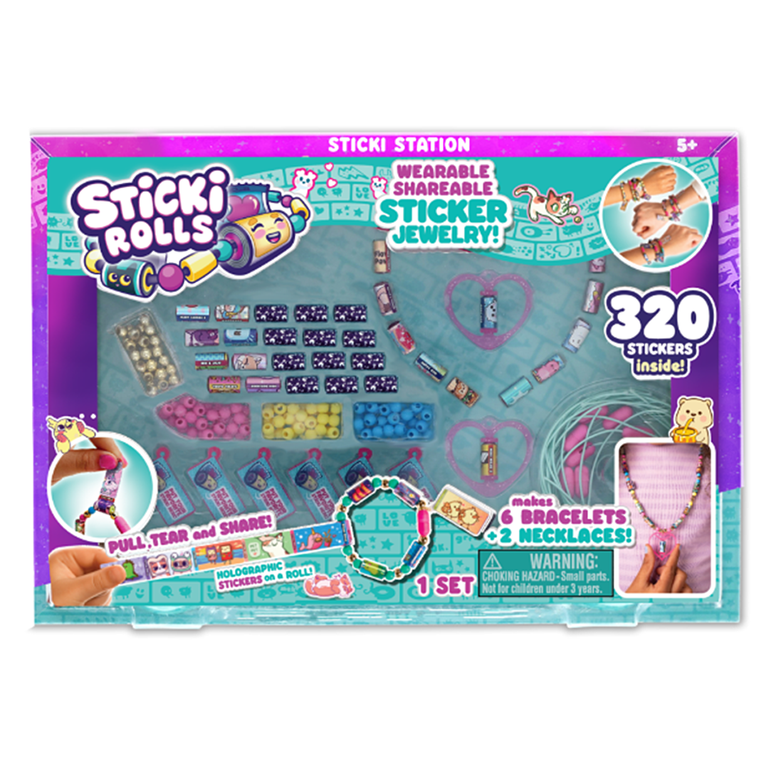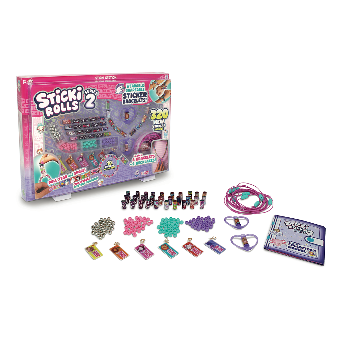 Le coffret Sticki de rouleaux Sticki est le kit parfait de bijoux à faire soi-même ! Tu peux créer 6 bracelets et 2 colliers avec les 144 perles bijoux, 6 bracelets élastiques, 2 colliers élastiques, 2 pendentifs et 6 étiquettes porte-bonheur. Profite aussi des 32 rouleaux Sticki, des 320 autocollants et du livret à collectionner !