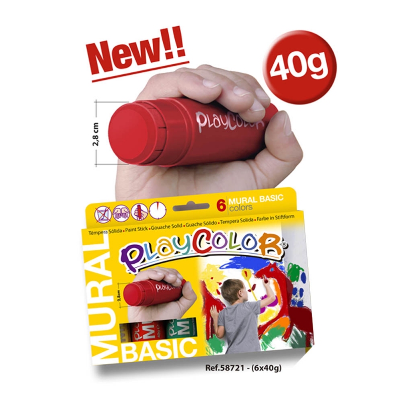PLAYCOLOR - MURAL BASIC ONE - XXL6 Sticks de peinture gouache solide 40g - Diamètre 28mm - coloris assortis- Ne nécessite ni eau ni pinceau- En appuyant doucement cela donne un aspect cire et en appuyant fortement un aspect gouache- Fort pouvoir couvrant- Couleurs brillantes- Aspect satiné- Ce produit n'abîme pas le mur et ne nécessite aucun vernis- Séchage rapide Vous pourrez dessiner et peindre d'une manière plus facile, plus propre et plus amusante. Il convient pour peindre sur les murs et sur de grandes surfaces.Ce produit est à appliquer directement, sans ajouter d'eau.Parfait pour la décoration de vos murs