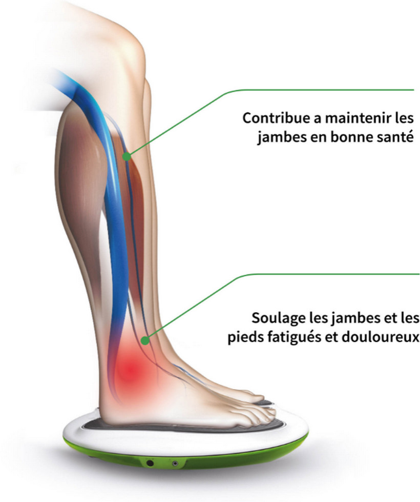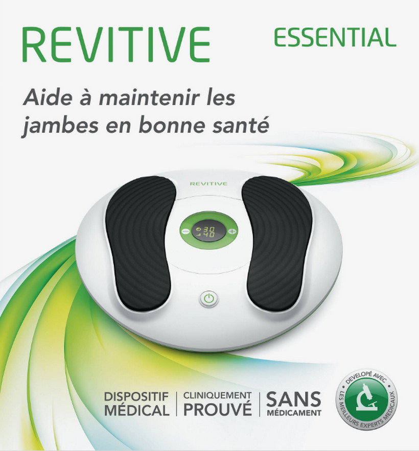 6655-RLV-FR-BEN - stimulateur circulatoire pour les jambes - Les jambes fatiguées, douloureuses et lourdes sont souvent des symptômes du ralentissement du flux sanguin dans les jambes. Ces symptômes peuvent être dus à l'âge, au mode de vie, comme le tabagisme et la station prolongée debout ou assise, à de fortes chaleurs, ou à un trouble médical sous-jacent. Essential 6655-RLV-FR-BEN est le stimulateur circulatoire Revitive qui cible et soulage les problèmes dans les jambes comme la sensation de fatigue, de lourdeur dans les jambes et les pieds, que ce soit occasionnel ou plus fréquent. Parfait après une longue journée !Chez Revitive, nous pensons que chacun mérite d'avoir une opinion positive de sa santé. Depuis plus de 20 ans, nous vous apportons des solutions thérapeutiques sans médicament chez vous, grâce aux avancées cliniques et scientifiques de nos partenariats avec des chirurgiens vasculaires et des kinésithérapeutes en Recherche & Développement et nos programmes continus d'essais cliniques en hôpital. Notre expertise permet de vous offrir des systèmes et technologies brevetées, à haute performance, testés cliniquement dont l’efficacité est avérée par des preuves publiées dans les journaux médicaux internationaux et disponibles pour consultation sur revitive.fr.Pour améliorer le retour veineux, nos stimulateurs circulatoires utilisent la technologie brevetée Revitive, basée sur l'EMS, l'electrostimulation musculaire, utilisée en cabinet de kinésithérapie, qui envoie des ondes électriques sous la plante du pied et active la contraction des muscles dans les jambes, comme une pompe. Plus les muscles travaillent, plus l'action de compression musculaire est importante, et plus il est facile pour les veines de pousser le sang vers le cœur. Avec une utilisation régulière, la technologie Revitive renforce les muscles des jambes et améliore la circulation pour maintenir vos jambes en bonne santé.Revitive Essential est efficace et simple à utiliser. Calez votre séance quotidienne de 30 minutes sur le rythme de votre journée, assis confortablement. Prenez soin de vos jambes et retrouvez les activités que vous aimez sans douleur !Revitive Essential est adapté aux problèmes de jambes lourdes et de mauvaise circulation tels que des douleurs et des gonflements légers ou occasionnels, causés par :- Position assise/debout prolongée- Mode de vie sédentaire- Fortes chaleursIl est conçu pour :- Améliorer activement la circulation- Soulager les jambes lourdes et douloureuses- Maintenir la bonne santé du système veineuxPour les personnes souffrant de problèmes de circulation plus persistants, comme les gonflements et les douleurs durables, la gamme de stimulateurs Haute Performance REVITIVE Medic est mieux adaptée car conçue spécialement pour soulager ces symptômes, pouvant être causés notamment par le manque de mobilité prolongé, l'hypertension, l'arthrose, un taux de cholestérol élevé, le diabète ou les varices.Cet appareil est un dispositif médical et porte des contre-indications – Ne pas utiliser dans les cas suivants :- Port d'un dispositif électronique implanté tel qu'un pacemaker ou un défibrillateur cardioverteur implantable automatique (DCIA)- Grossesse- Thrombose veineuse profonde (TVP) existanteLivré avec notice, 2 électrodes corporelles REVITIVE, prise secteur