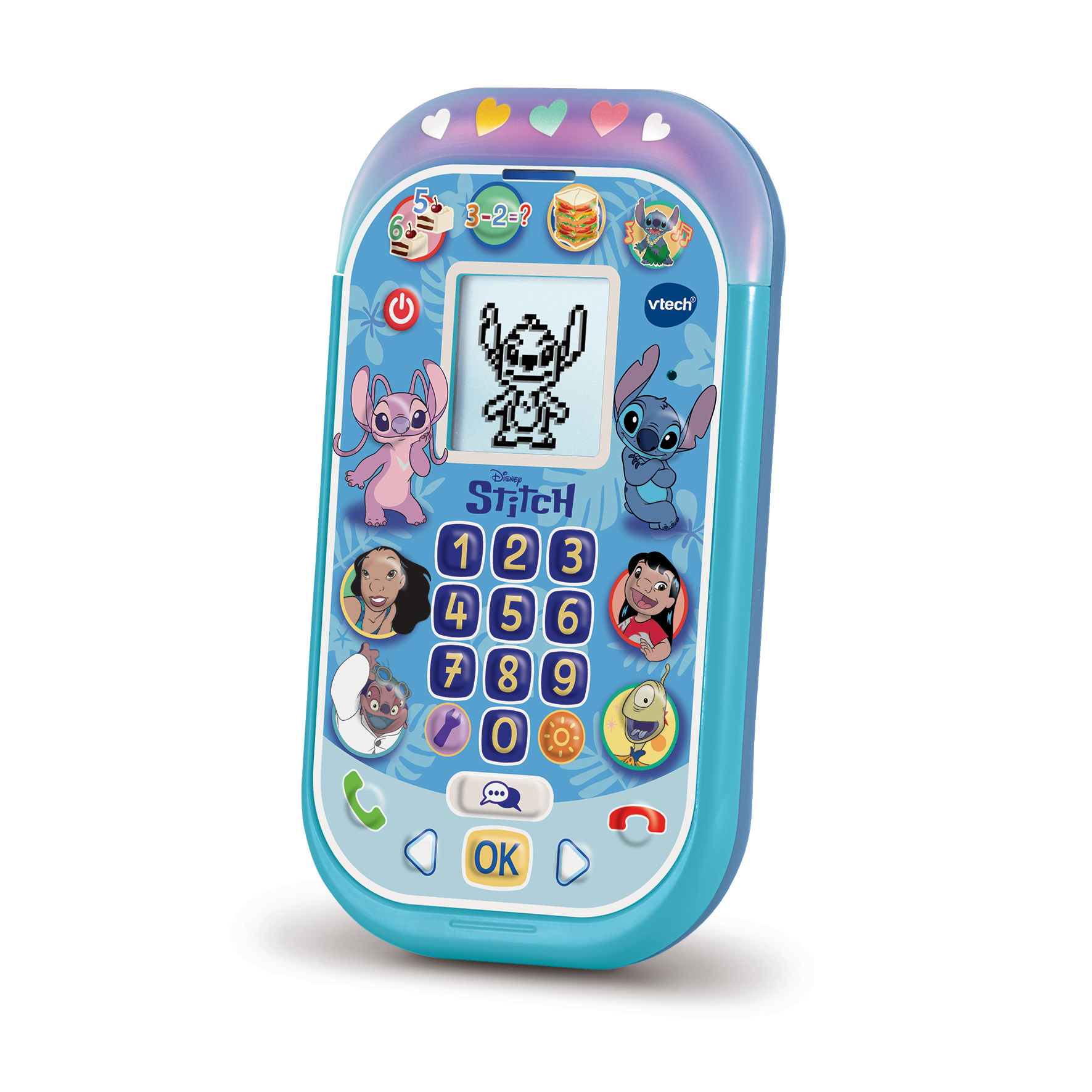 Un téléphone interactif et lumineux pour apprendre et jouer avec Stitch et ses amis ! L’écran LCD anime Stitch, Lilo et leurs amis à travers : 4 jeux pour découvrir les chiffres, apprendre à compter, travailler sa logique et sa mémoire. 6 touches Personnages pour les découvrir et jouer avec eux. 1 bouton conversation pour jouer à un jeu de questions-réponses. 1 touche appel pour imiter une conversation avec les personnages de la série. 1 micro pour jouer et interagir avec les personnages. 1 clavier avec 10 touches Chiffres. 1 bouton Réglages pour ajuster le contraste, activer ou désactiver la musique de fond et choisir sa propre sonnerie. Écran LCD et contour lumineux. Arrêt automatique. Boite Try-me. Fonctionne avec 2 piles LR6 fournies.