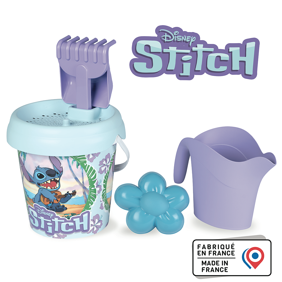 Seau de plage garni (diamètre 17) décoré avec un IML Stitch - Inclus un tamis, un râteau et une pelle, un arrosoir et un moule à sable. A partir de 18 mois. Fabrication française