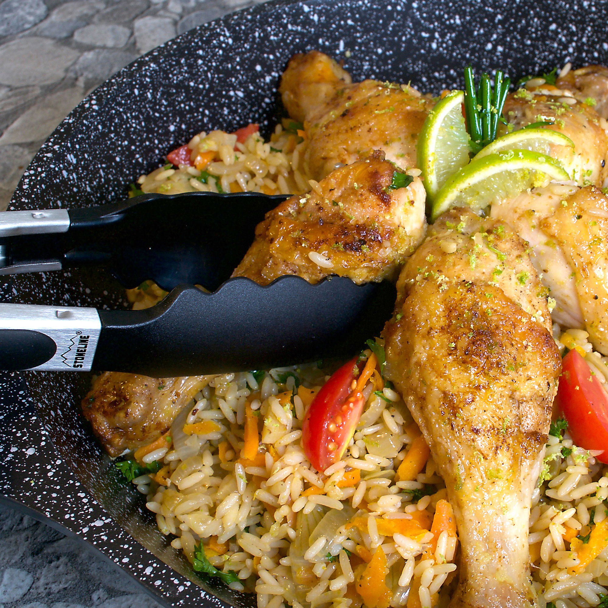 STONELINE® – L’original ! Avec cette pince multifonction pratique, de petits morceaux de viande tout comme des légumes se laissent parfaitement saisir et retourner. Cette pince universelle peut être utilisée comme pince de cuisine ou de grillades, mais aussi pour retourner des aliments dans la poêle, pour servir des pâtes ou de la salade. Elle est idéale pour des poêles et casseroles revêtues et, grâce à son revêtement de silicone, offre une prise en main sans déraper. Le mécanisme de fermeture permet un stockage non encombrant. 1 pince de cuisine, longueur env. 27 cm Design original STONELINE® Nettoyage facile : rincer avec de l’eau chaude, sécher, fini Résistant à la chaleur jusqu’à 210 °C Matériau : Acier inoxydable, silicone, nylon