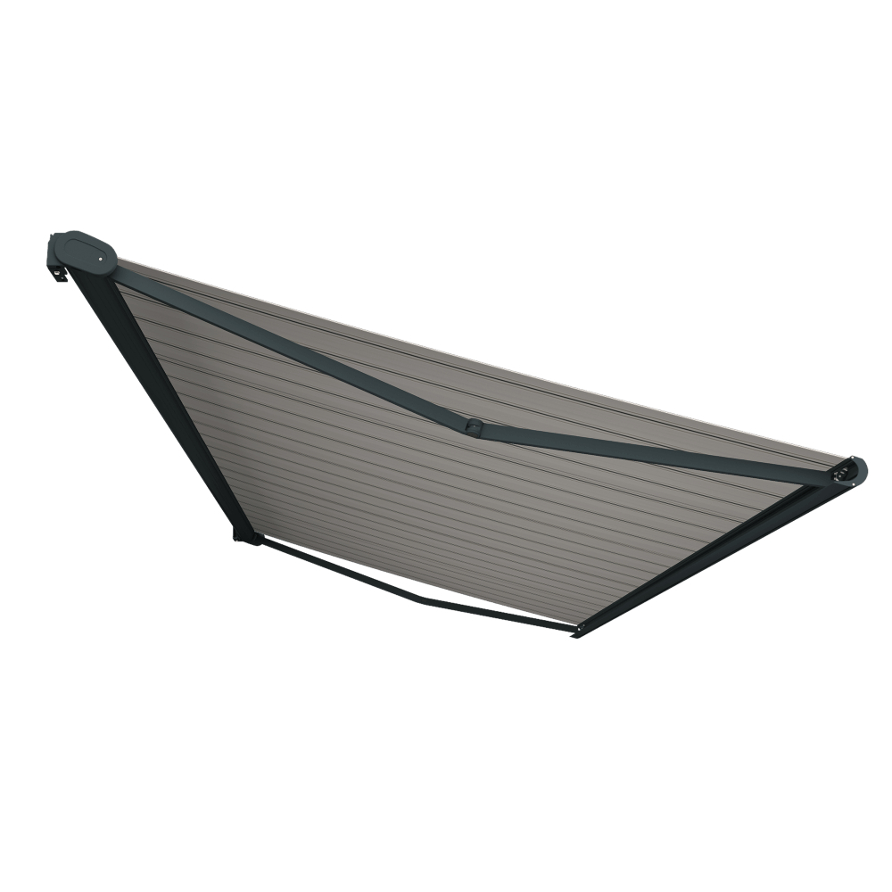 Structure en aluminium extrudé thermolaqué gris anthracite structuré. Tube d'enroulement en acier galvanisé de diamètre 78mm. Bras en aluminium avec double câble en acier inoxydable, protégé par une gaine isolante. Testé plus de 10000 cycles (1 cycle = 1 ouverture et 1 fermeture).