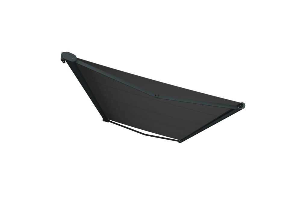 Structure en aluminium extrudé thermolaqué gris anthracite structuré. Tube d'enroulement en acier galvanisé de diamètre 78mm. Bras en aluminium avec double câble en acier inoxydable, protégé par une gaine isolante. Testé plus de 10000 cycles (1 cycle = 1 ouverture et 1 fermeture).