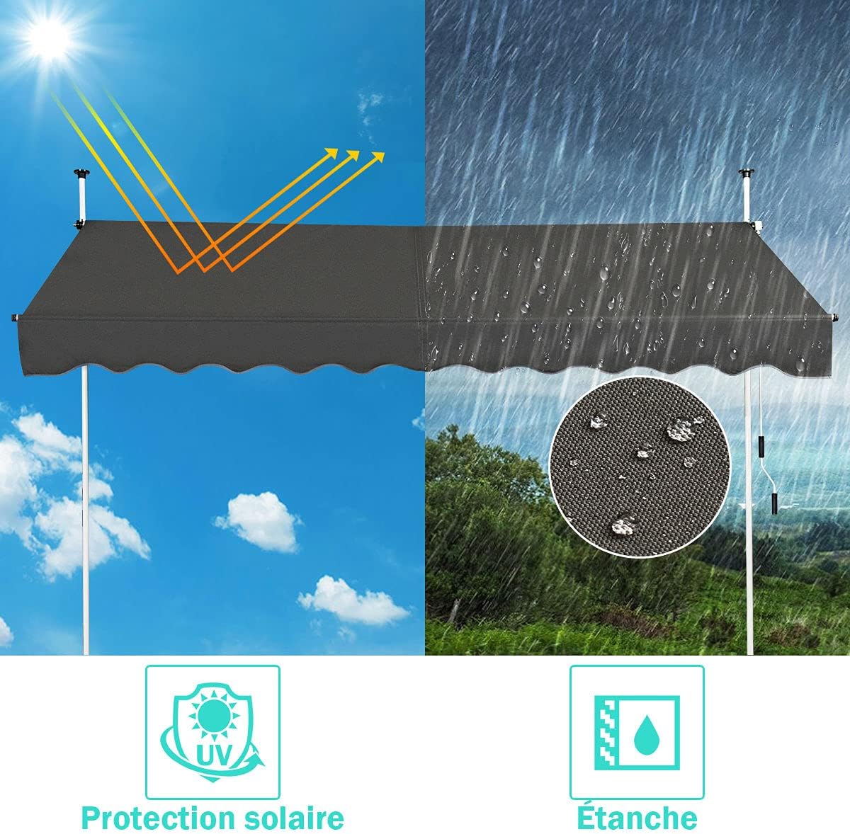 - Cadre en aluminium et tissu de qualité supérieure:Fabriqué en aluminium de qualité et rail avant en acier, le cadre du store est robuste et stable. La bâche est en tissu Oxford PU résistant à la lumière du soleil et imperméable. L'auvent vous protège des averses d'été, des rayons ultraviolets et de la lumière intense.