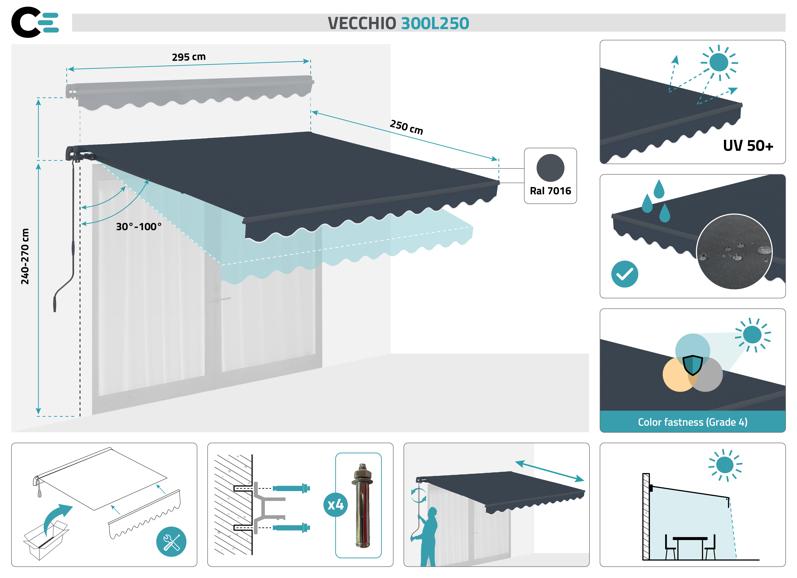 Store banne monobloc manuel 3x2,5m - Cazeboo - VECCHIO - Gris - Rétractable - Anti-UV - Déperlant - Surfa