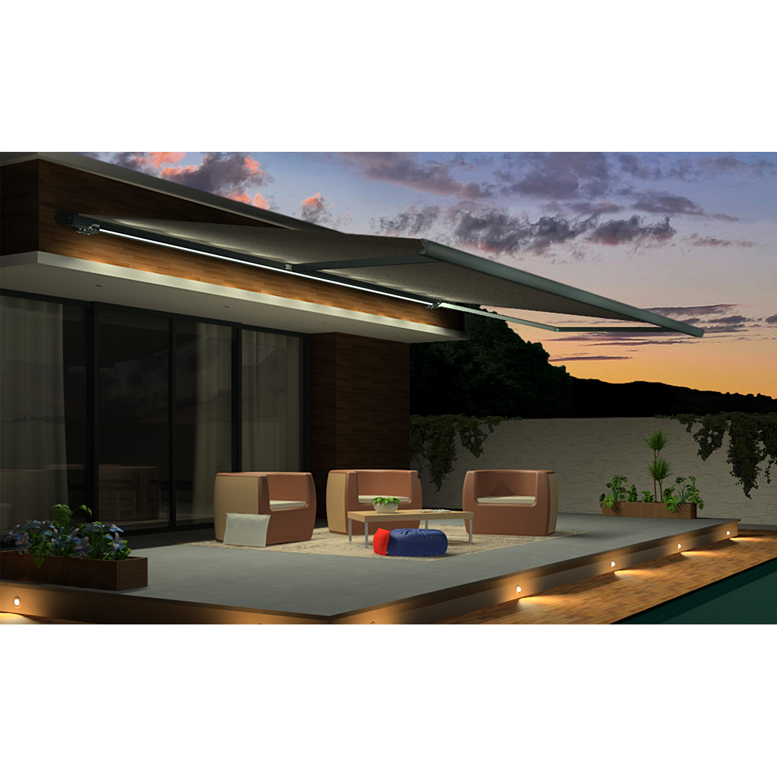 Libellé Store coffre SUZY LED anthracite 5mx3m50 motorisé toile S126 uni gris foncé