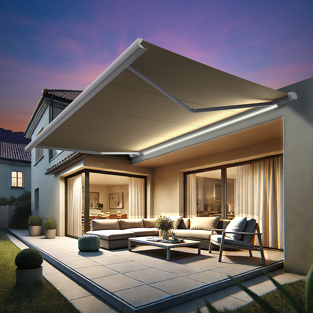 Store coffre SUZY avec LED, armature blanche, largeur 5m x avancée 3,5m motorisé avec télécommande+secours toile acrylique S130 uni taupe