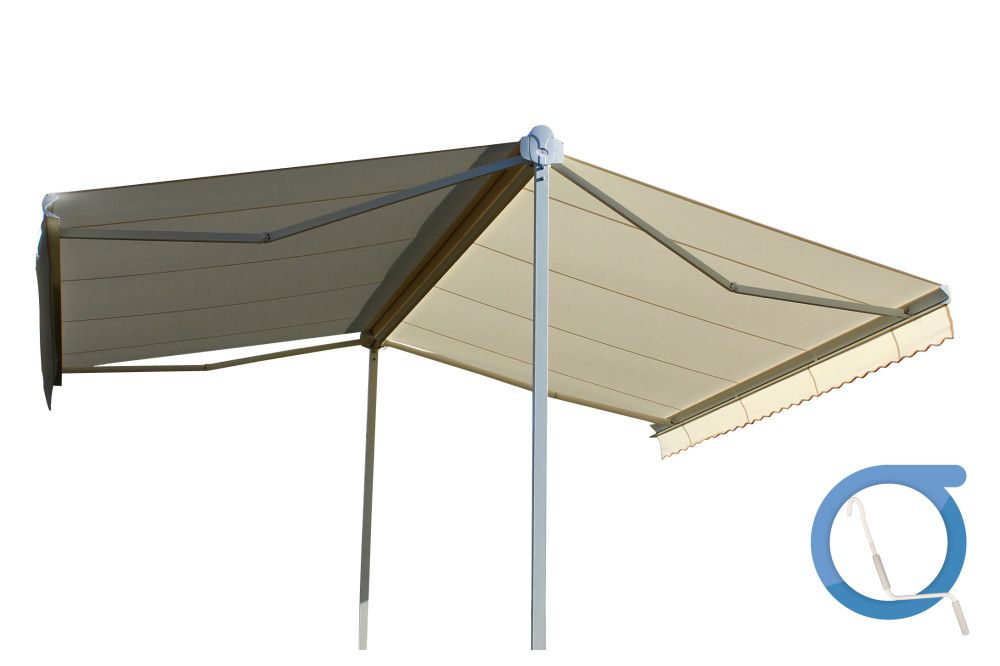 • Store - Store double pente - Aluminium extrudé thermolaqué - Pieds en acier galvanisé thermolaqué - Manœuvre manuelle à manivelle - Coffre intégral - Inclinaison 0 à 15° - Toile acrylique teintée dans la masse
