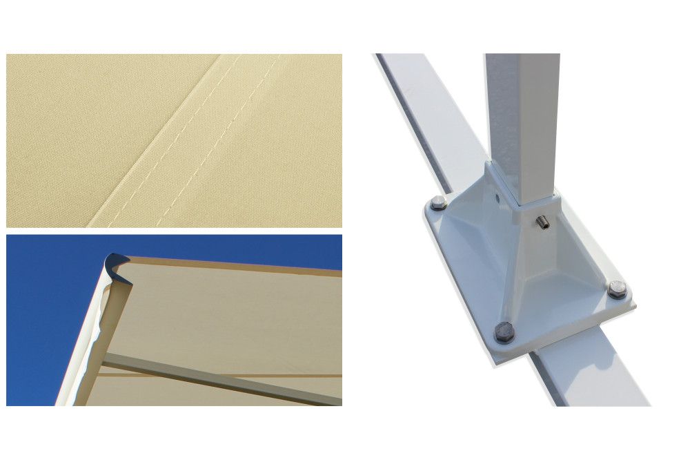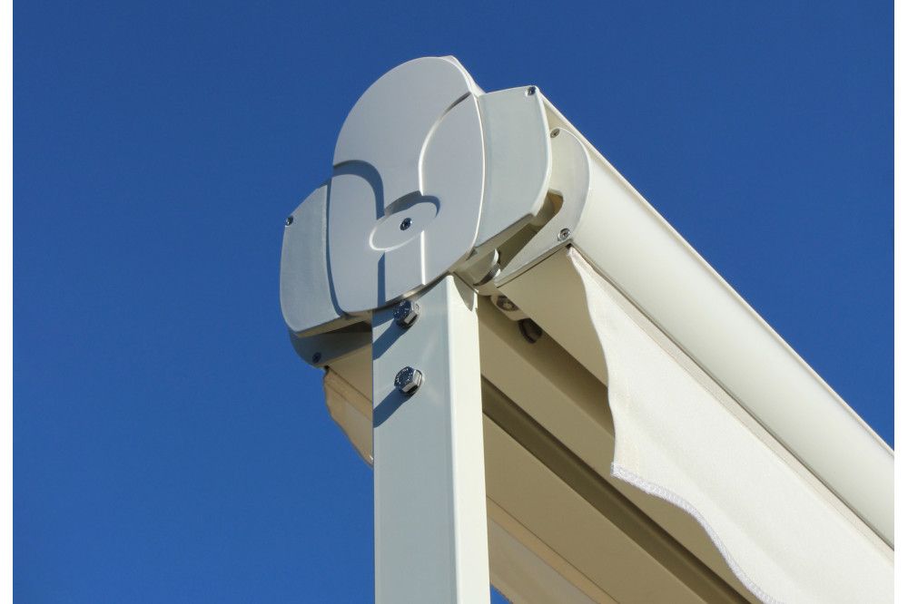 Pieds en acier galvanisé thermolaqué & structure en aluminium extrudé thermolaqué blanc pur satiné. Tube d'enroulement de diamètre 70mm assurant la rigidité du tube. Bras en aluminium à sangles. Testé plus de 10000 cycles (1 cycle = 1 ouverture et 1 fermeture)