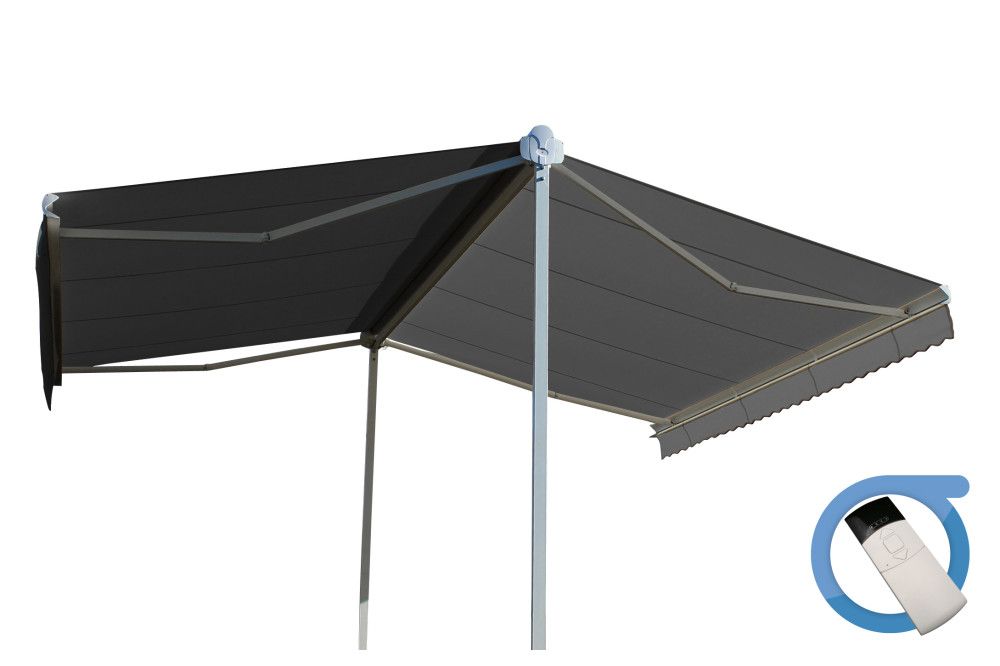 - Store - Store double pente - Aluminium extrudé thermolaqué - Pieds en acier galvanisé thermolaqué - Manœuvre motorisée à télécommande - Coffre intégral - Inclinaison 0 à 15° - Toile acrylique teintée dans la masse