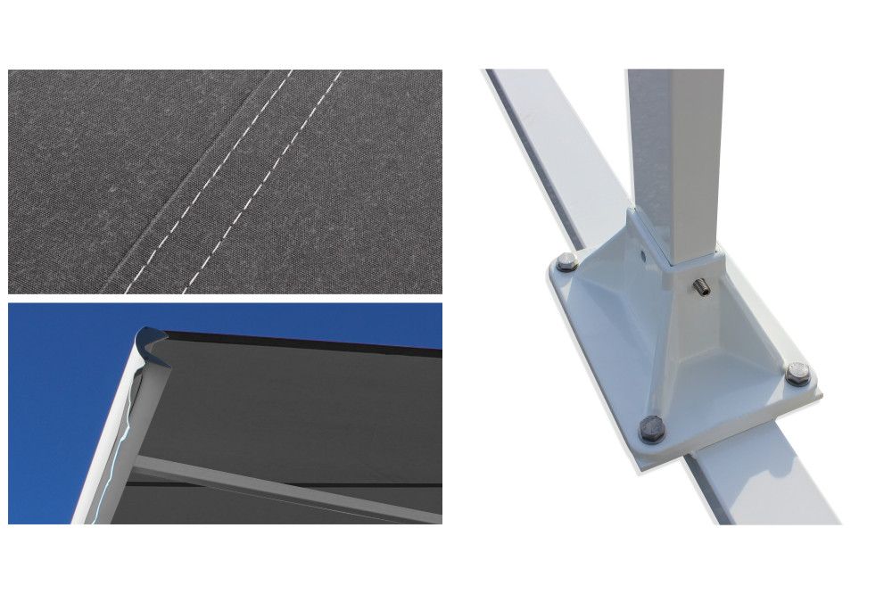 Pieds en acier galvanisé thermolaqué & structure en aluminium extrudé thermolaqué blanc pur satiné. Tube d'enroulement de diamètre 70mm assurant la rigidité du tube. Bras en aluminium à sangles. Testé plus de 10000 cycles (1 cycle = 1 ouverture et 1 fermeture)