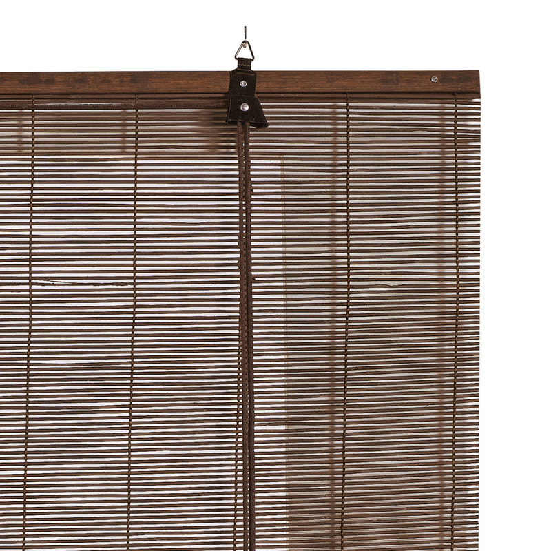 Store en bambou fabriqué en bambou teinté 100% naturel. Il s'agit d'un store qui permet de voir à l'extérieur et laisse entrer la lumière naturelle, avec une intimité réduite de jour comme de nuit. Ce store en bambou est composé de lamelles de bambou très fines qui sont reliées entre elles par des fils de la même couleur que le store, ce qui permet d'obtenir une esthétique plus uniforme et plus élégante. Le fonctionnement est très simple, il se fait au moyen d'un cordon qui se trouve à droite du store. Le cordon est également de la même couleur que le store, offrant ainsi une meilleure finition. De plus, c'est un store en bambou qui est très facile à installer et qui comprend tout le nécessaire pour son installation : pinces et système de sécurité enfant. L'installation se fait au mur. Il s'agit d'un store d'intérieur, qui donnera une touche de chaleur et de naturel à n'importe quel environnement : chambre, salon, salle à manger, bureau... Nous ne recommandons pas son installation à l'extérieur, car le contact direct avec le soleil peut faire pâlir le store. L'entretien du store est très simple, vous pouvez passer l'aspirateur ou le brosser doucement.
