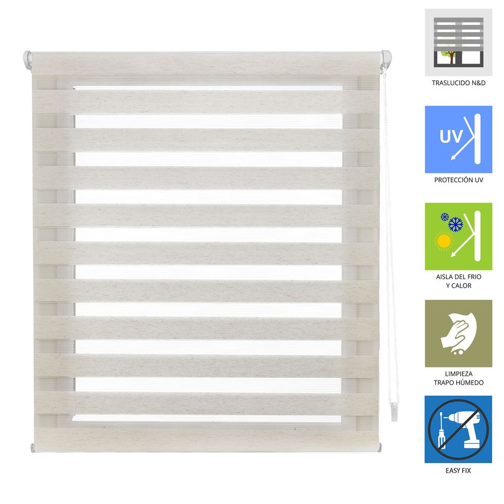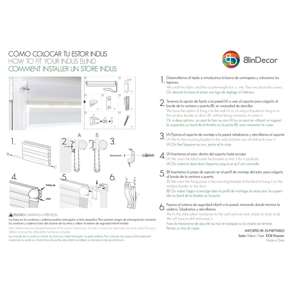 PAS D'OUTILS ! Store enrouleur décoratif Facile à fixer, tissu double Nuit et Jour. Avec les stores enrouleurs Nuit et Jour, nous avons la possibilité de choisir l'entrée de lumière pour chaque instant, en superposant les rayures les plus opaques avec les plus translucides, nous obtenons un effet de lumière magique. Il a un contrepoids décoratif. Son mécanisme à chaîne vous permet de monter et descendre le store de manière simple et confortable. Les stores enrouleurs Blindecor sont la meilleure option pour réguler l'entrée de la lumière et gagner en intimité, que ce soit dans votre salon, votre chambre ou votre bureau. Grâce à son design élégant et à sa protection UV, vous pouvez profiter d'une atmosphère agréable et fraîche en permanence. Idéal pour toutes les pièces de la maison (salle de bain, salon, salle à manger, chambre). Equipé d'un mécanisme à chaînette, la hauteur se règle au grès de vos envies. Indus est un modèle à double tissu nuit et jour bicolore, avec lequel vous obtiendrez un espace personnel et authentique. Grâce à son système d'installation facile à fixer, vous n'aurez qu'à placer le store à l'aide de ses adhésifs ou de ses clips sur le cadre de votre fenêtre, sans avoir à utiliser de perceuse. De plus, son mécanisme à chaîne vous permettra de monter et descendre facilement le store pour ajuster l'accès à la lumière. Jour/Nuit recoupable en largeur. Double tissu composé de bandes en voile et de bandes tamisantes. Fixations sans perçage fournies pour fixer le store sur l'ouvrant. Réglable en hauteur par un mécanisme à chaînette et une barre de lestage coordonnés. Ureux et accueillant. Fixations à visser fournies. Réglable en hauteur par un mécanisme à chaînett. Caractéristiques : Coloris : Blanc Matière : 100% Polyester Dimensions : 52 longueur180 largeur cm Les soins :Nettoyage avec un chiffon doux légèrement humide. Ne pas utiliser de produits chimiques Occultant ou translucide ? Votre premier choix est de savoir si vous souhaitez un store occultant ou translucide/lumière du jour ; ce store peut être fait comme l'un ou l'autre. Un store occultant élimine la lumière et vous offre 100 % d'intimité, ce qui en fait un bon choix pour les chambres car il vous aide à passer une bonne nuit de sommeil, en bloquant la pollution lumineuse ainsi que le soleil levant au printemps et en été. Comme la doublure occultante bloque la lumière du soleil, elle aide également à garder votre pièce fraîche et sombre. Mais pendant les mois d'hiver, le revêtement occultant à 3 couches ajoute une couche supplémentaire d'isolation, donnant au store des propriétés thermiques que l'on ne trouve pas sur les stores non occultants. Il protège à la fois contre la perte de chaleur et le gain de chaleur, régulant la température de votre pièce pour que vous soyez au chaud en hiver et au frais en été. Le dernier avantage d'un store occultant est qu'il résiste à l'humidité et qu'il convient donc aux cuisines et aux salles de bain. En revanche, un store translucide/lumière du jour offre toujours une certaine intimité sans bloquer toute la lumière. Ils sont une bonne option pour les pièces comme le salon ou le bureau à domicile où vous avez juste besoin d'arrêter l'éblouissement du soleil tout au long de la journée.