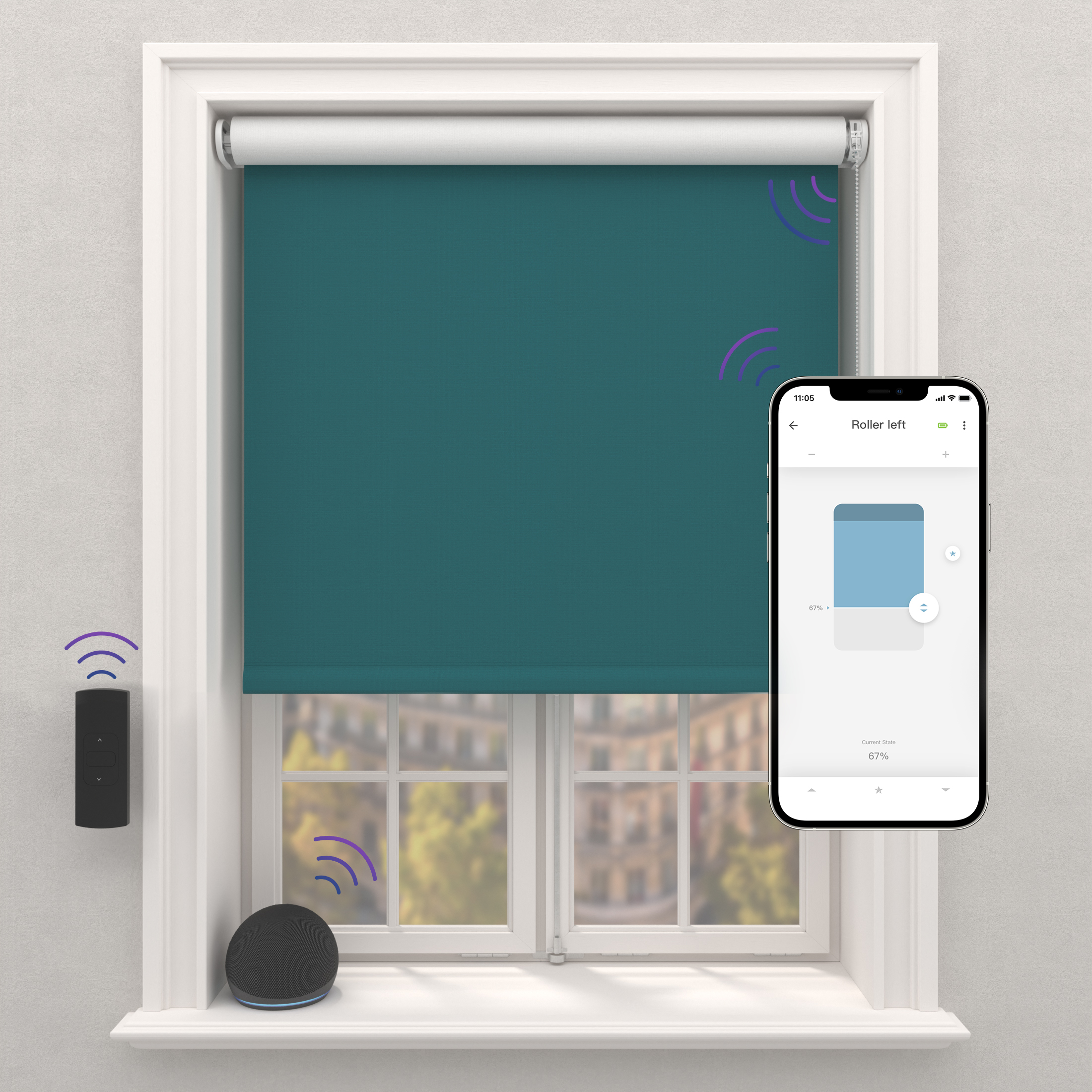 Ce store enrouleur est équipé d'un moteur Motionblinds. Le moteur vous permet d'actionner le store avec la télécommande (vendue séparément) ou via l'application Motionblinds (pont Wi-Fi requis, non inclus). Le store motorisé se présente ainsi sans chaînette et est donc sans danger pour les enfants. Vous pouvez facilement régler des positions favorites à l'aide du cordon de traction, ce qui facilite également les opérations quotidiennes d'ouverture et de fermeture. Le moteur dispose d'une batterie rechargeable par câble micro-USB qui nécessite moins de 2 charges par an. Vous pouvez utiliser une seule télécommande pour plusieurs stores. L'ajout d'un pont Wi-Fi vous permettra d'utiliser toutes les fonctions domotiques, dont la commande vocale et les minuteries, ainsi que d'autres application domotiques pour l'éclairage ou le thermostat. Le store peut être monté par perçage sur le mur ou le plafond.