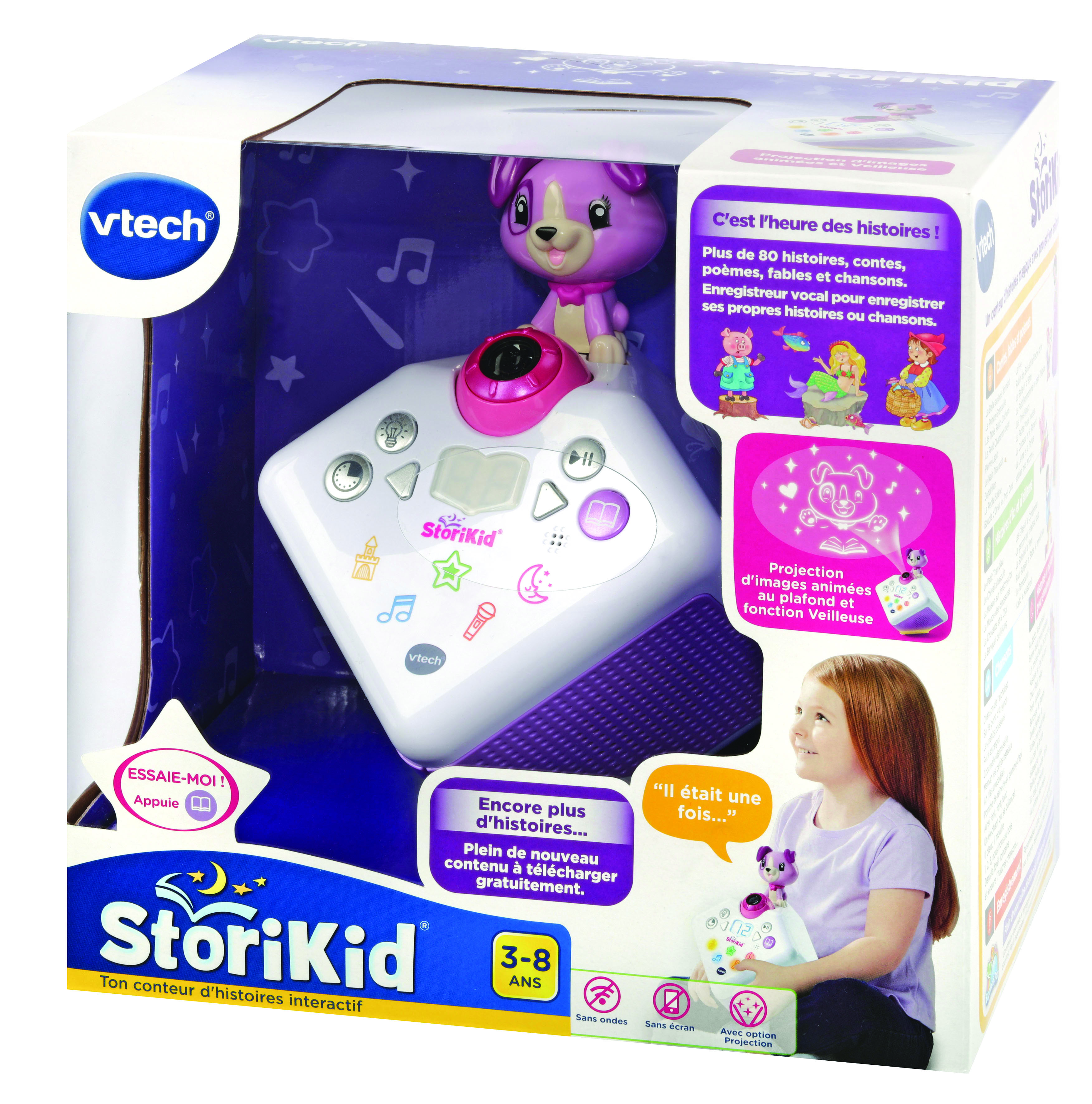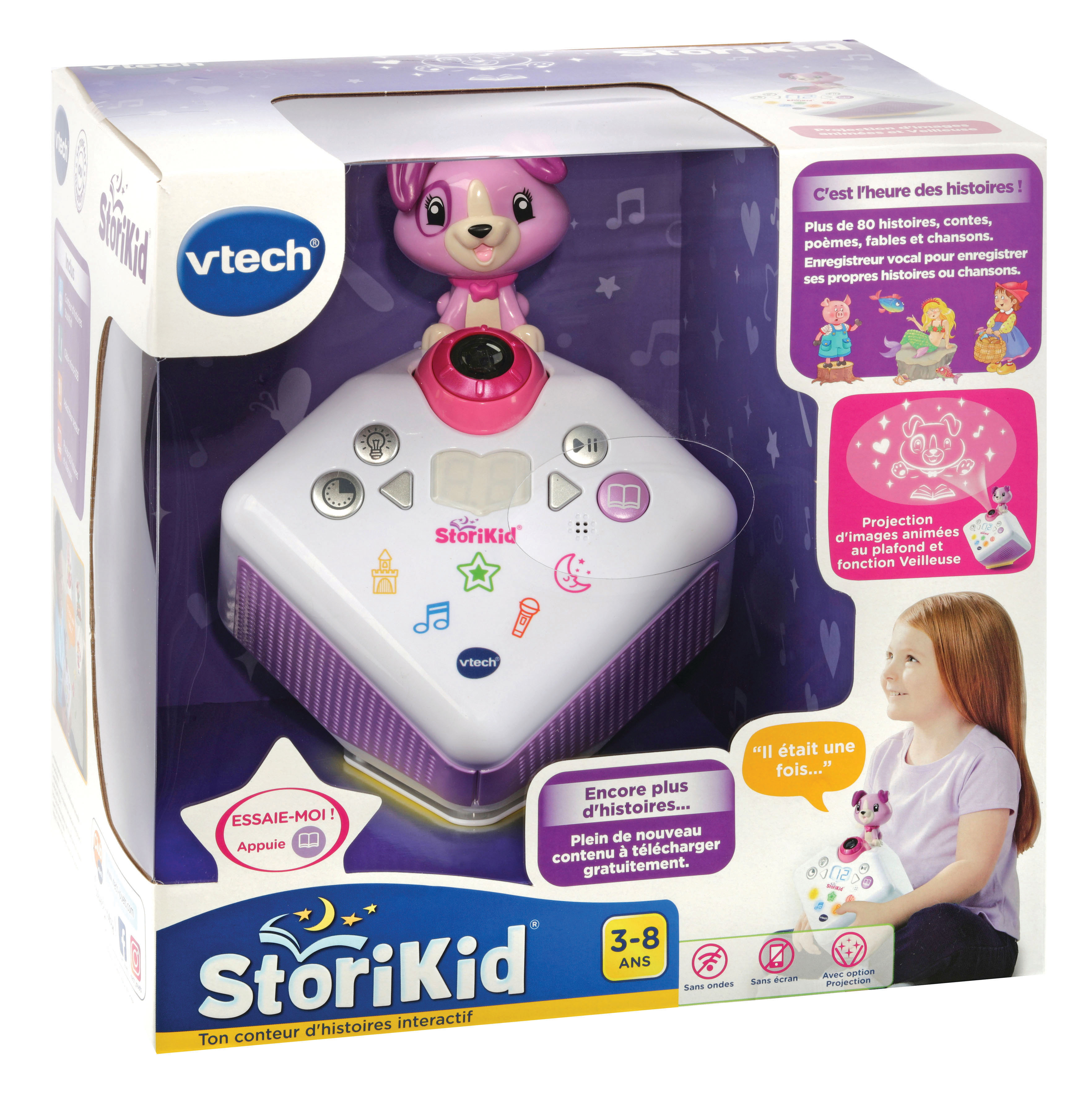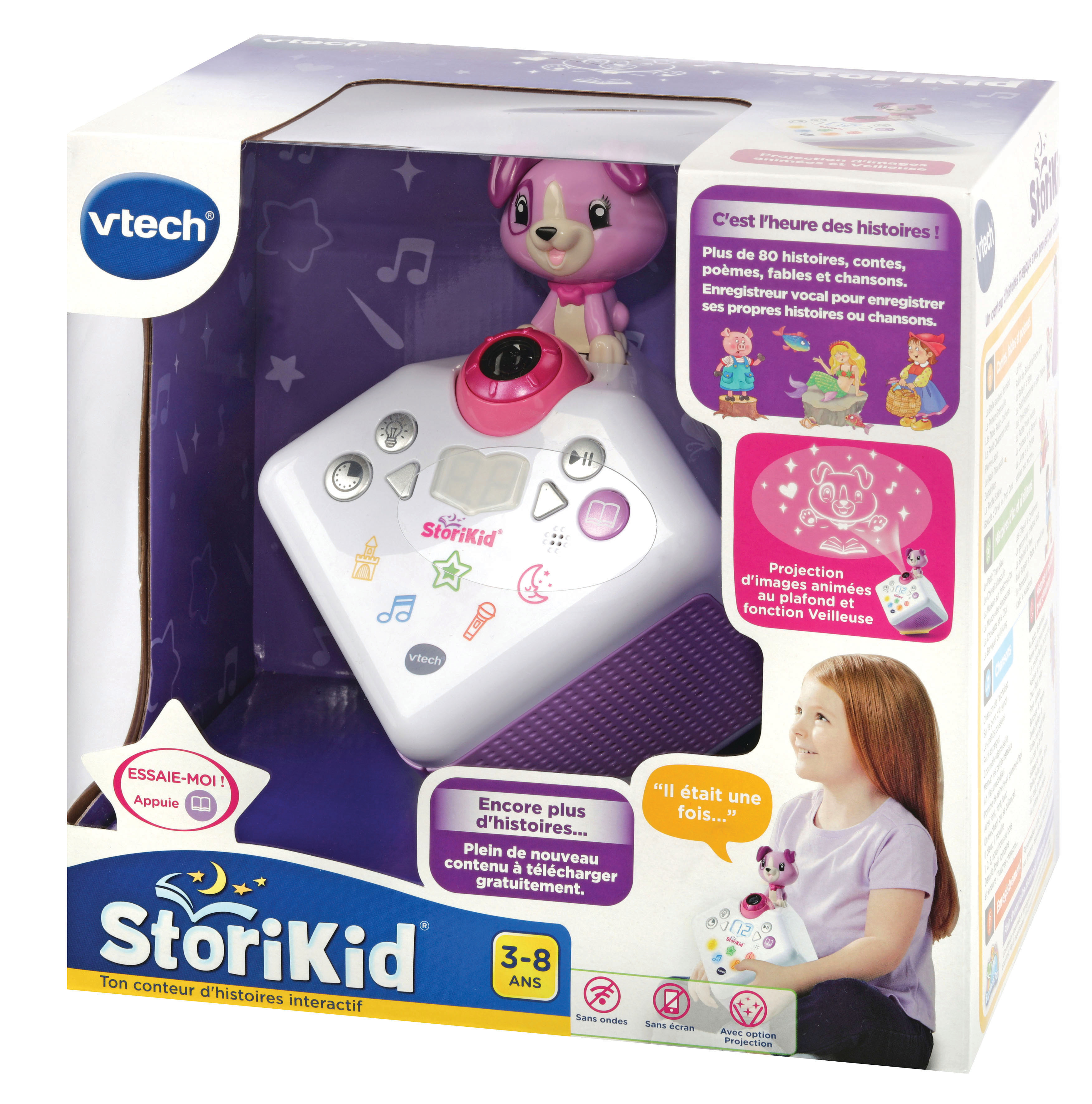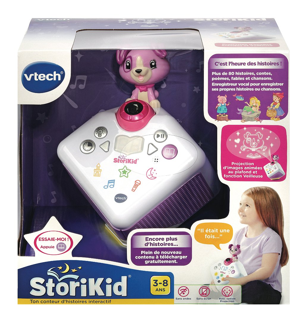 StoriKid - Mon conteur d’histoires (rose) - 3 - 8 ans Un conteur d’histoires avec projection lumineuse pour s’endormir en histoire ou en chanson. Les différentes voix des personnages et narrateur, les sons réalistes et les mélodies donnent vie aux histoires. Plus de 80 contenus inclus : 19 contes (Les trois petits cochon, Cendrillon, La Belle et la Bête, La petite sirène...), 16 poésies classiques (poèmes français d’auteurs classiques), 14 fables (La Fontaine et fables d’autres pays), 9 histoires pour s’endormir, 23 chansons. Magique ! La projection accompagne les histoires et chansons et le petit chien réagit et s’anime différemment en fonction du conte choisi. Les parents peuvent également enregistrer leur propre histoire ou chanson personnalisée. Jusqu’à 10 minutes d’enregistrement. Un bouton pour activer une jolie veilleuse Packs additionnels à télécharger gratuitement en ligne ! Une minuterie permet de choisir le nombre d'histoire à écouter. Mémoire interne pouvant contenir : 100 histoires de 4 minutes et 35 mélodies de 3 minutes Boîte try-me. Fonctionne avec 4 piles LR6 fournies ou adaptateur secteur inclus.