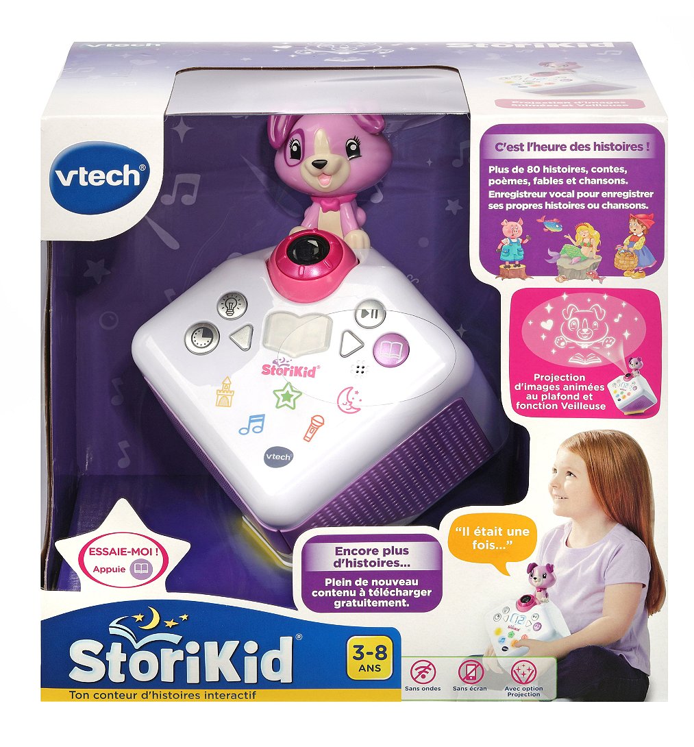 StoriKid - Mon conteur d’histoires (rose) - 3 - 8 ans Un conteur d’histoires avec projection lumineuse pour s’endormir en histoire ou en chanson. Les différentes voix des personnages et narrateur, les sons réalistes et les mélodies donnent vie aux histoires. Plus de 80 contenus inclus : 19 contes (Les trois petits cochon, Cendrillon, La Belle et la Bête, La petite sirène...), 16 poésies classiques (poèmes français d’auteurs classiques), 14 fables (La Fontaine et fables d’autres pays), 9 histoires pour s’endormir, 23 chansons. Magique ! La projection accompagne les histoires et chansons et le petit chien réagit et s’anime différemment en fonction du conte choisi. Les parents peuvent également enregistrer leur propre histoire ou chanson personnalisée. Jusqu’à 10 minutes d’enregistrement. Un bouton pour activer une jolie veilleuse Packs additionnels à télécharger gratuitement en ligne ! Une minuterie permet de choisir le nombre d'histoire à écouter. Mémoire interne pouvant contenir : 100 histoires de 4 minutes et 35 mélodies de 3 minutes. Boîte ouverte. Fonctionne avec 4 piles LR6 fournies ou adaptateur secteur inclus.