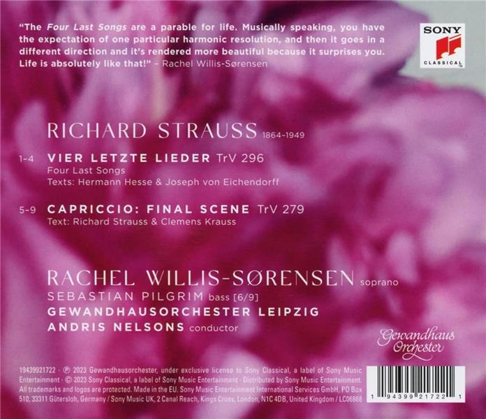 « Strauss : Four Last Songs » est deuxième album de l'impressionnante soprano américaine Rachel Willis-Sorensen, après son premier album « Rachel », acclamé par la critique : « Un talent hors du commun, capable de rivaliser avec les meilleurs exemples du passé, sans se contenter de suivre leurs traces. » (FRANCE) « Un ton séduisant (voluptueux, beurré, comme un bon chardonnay). » (FRANCE) Il comprend le cycle de chansons pour soprano le plus célèbre de Richard Strauss et la scène finale de son dernier opéra, « Capriccio ». Le timbre étincelant de Rachel, sa technique sans faille et son expressivité font d'elle l'interprète parfaite des oeuvres de Strauss. Pour info, elle fait ses débuts dans Arabella à Berlin en mars 2023. Elle est rejointe par les « Strauss -officionados » du Gewandhausorchester Leipzig et le chef d'orchestre Andris Nelsons.