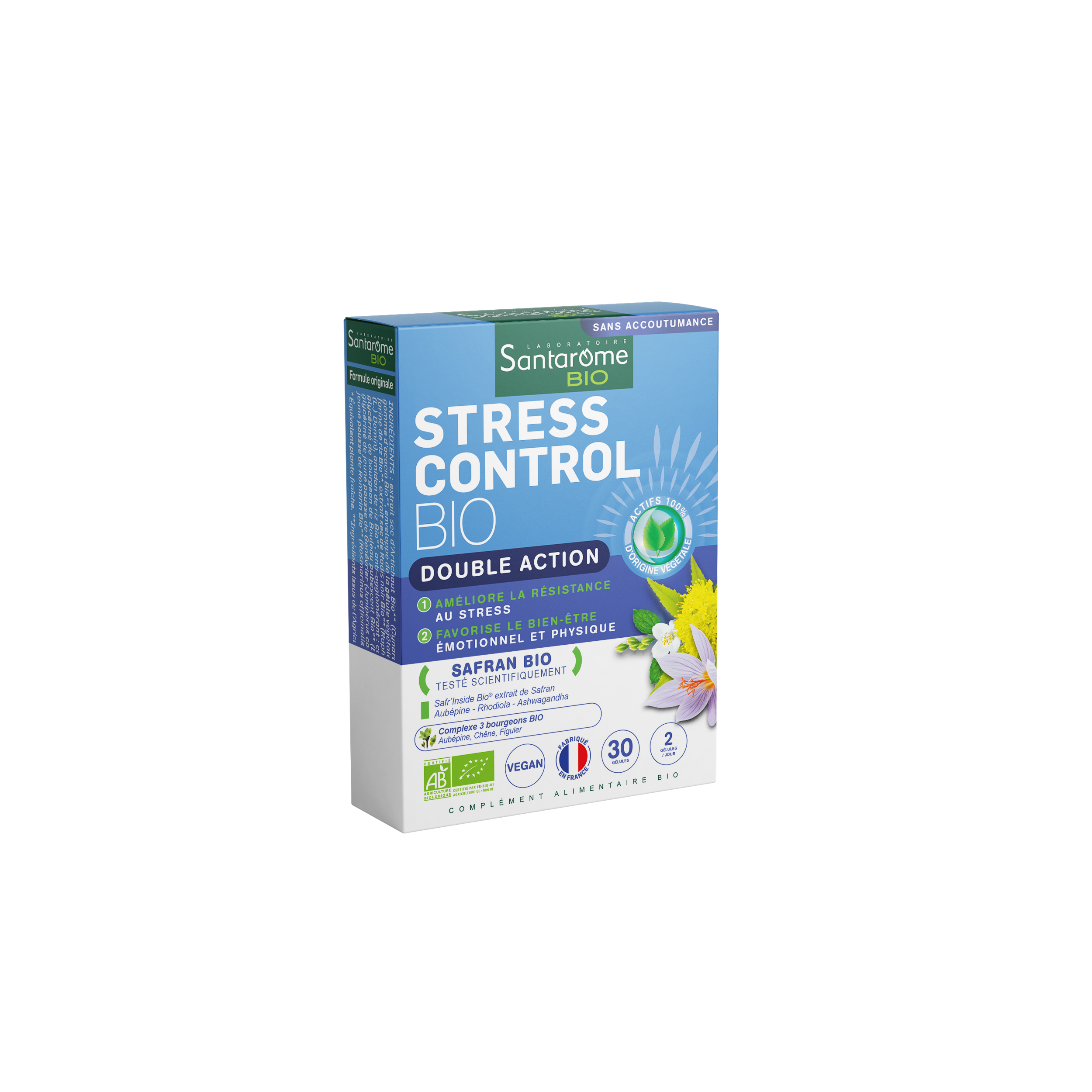 1 - Améliore la résistance au stress 2- Aide à réduire la nervosité et la fatigue mentale Santarome Stress Control Bio 30 Gélules est un complément alimentaire aux 4 actifs de plantes et 3 bourgeons spécialement sélectionnés : le safran favorise la relaxation et un état d'esprit positif. L'extrait de safran de cette formule, le Safr'Inside™ Bio, est breveté et a été testé scientifiquement ; la rhodiola aide à réduire l'impact négatif du stress et joue un rôle positif sur la fatigue liée au stress ; l'ashwagandha aide le corps à résister au stress passager ; l'aubépine aide à réduire la nervosité chez l'adulte. Le trio de bourgeons Bio d'aubépine, chêne et figuier, frais sauvages et récoltés à la main, contiennent l'ensemble des actifs de la plante. Sans dépendance. Certifié Agriculture Biologique. Contrôle FR-BIO-01. Vegan. Fabriqué en France.