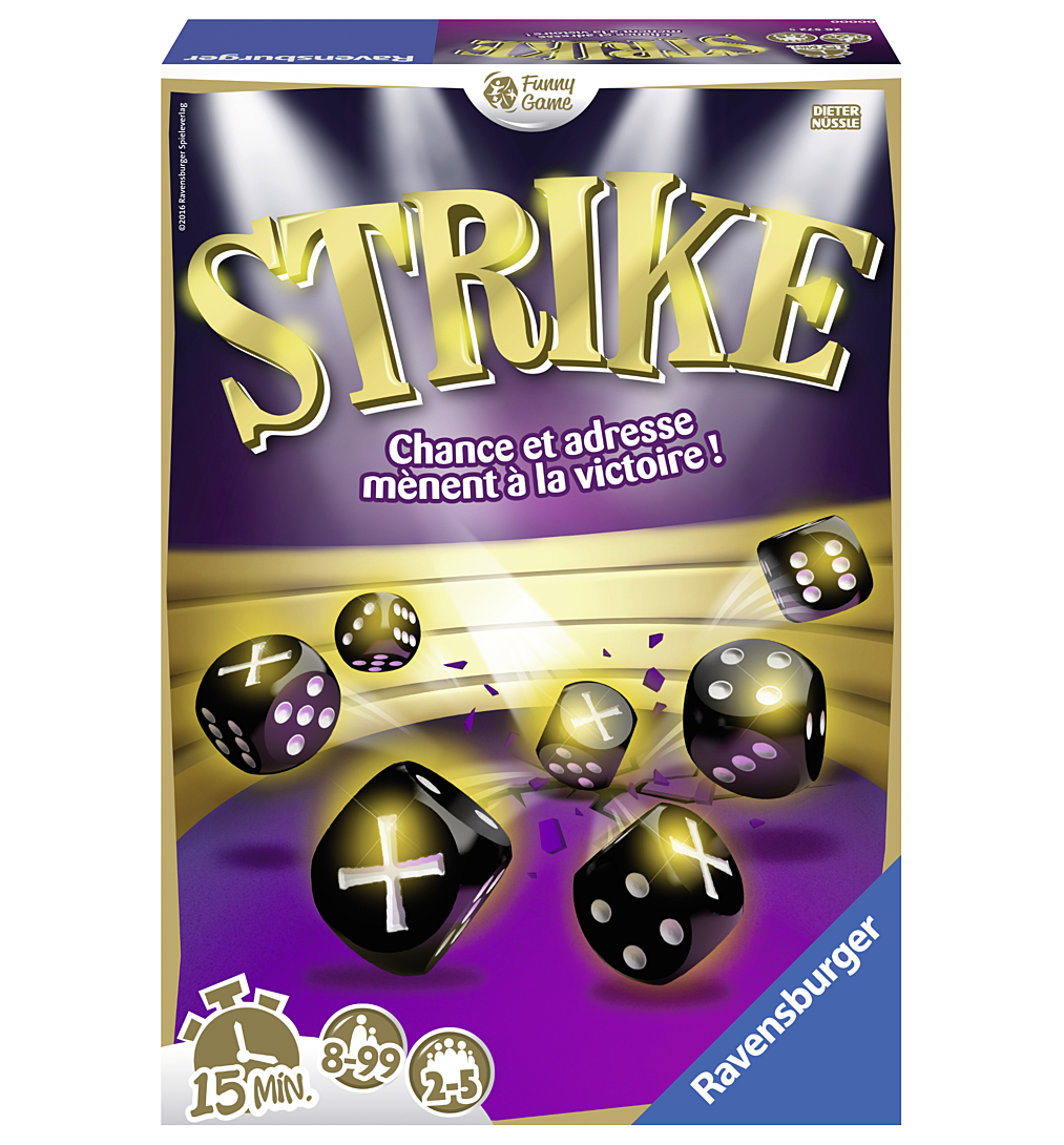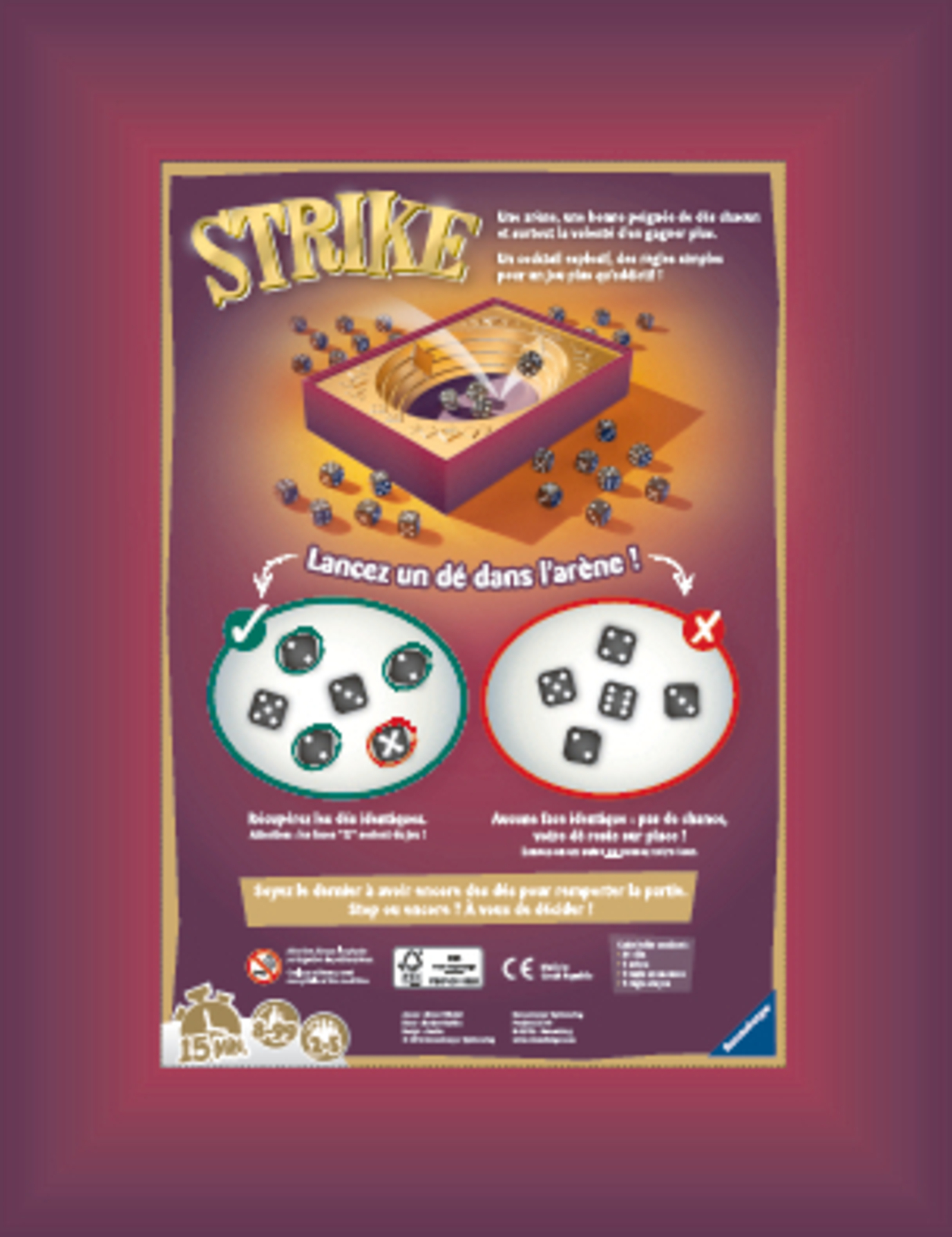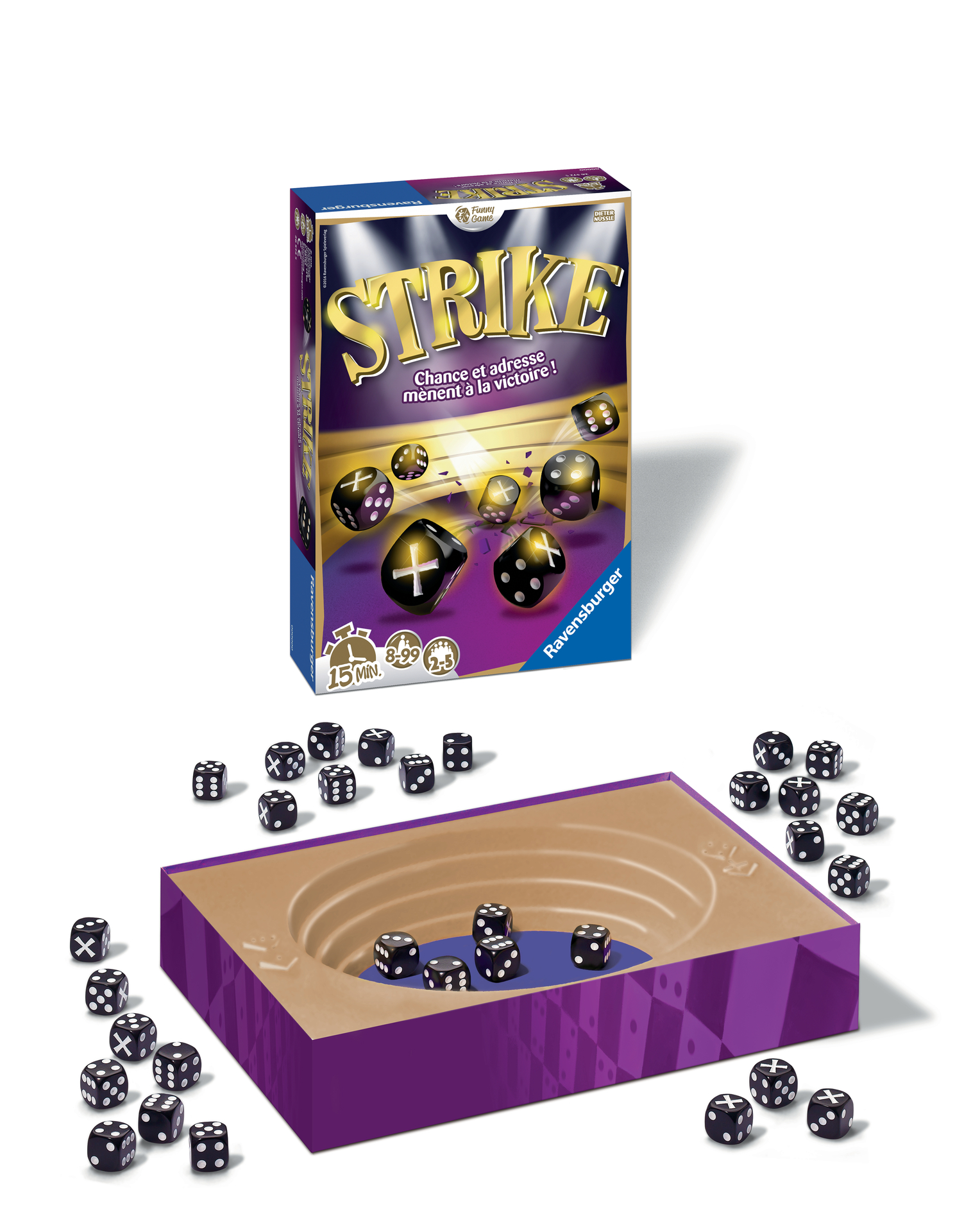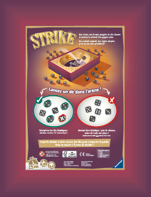 Une arène, une bonne poignée de dés chacun et surtout la volonté d'en gagner plus!Voici le cocktail explosif que Strike nous propose. Lancez votre dé avec dextérité sur ceux déjà présents dans l'arène. Obtenez au moins deux faces identiques et remportez les dés correspondants. Recommencez autant de fois que vous le souhaitez! Stop ou encore ? A vous de décider ! Mais attention : aucune face identique et vos dés restent dans l'arène, une croix et ils sont éliminés ! Remportez tous les dés et le joueur suivant sera obligé de tenter le Grand Lancer ! Qui réussira à rester en lice pour être consacré "Grand vainqueur de l'arène" ?