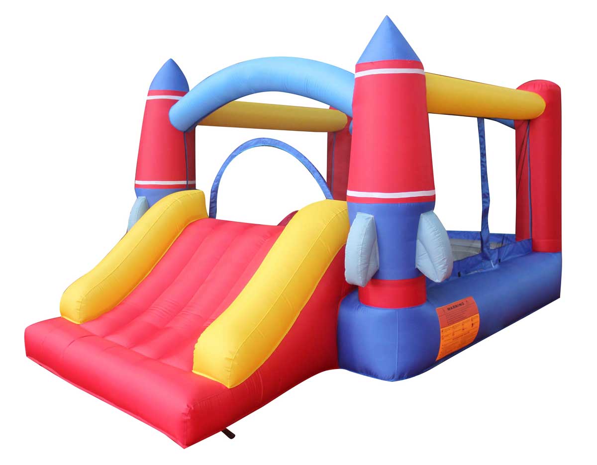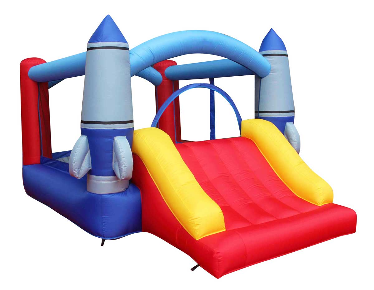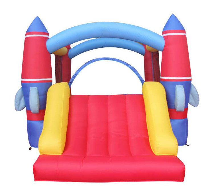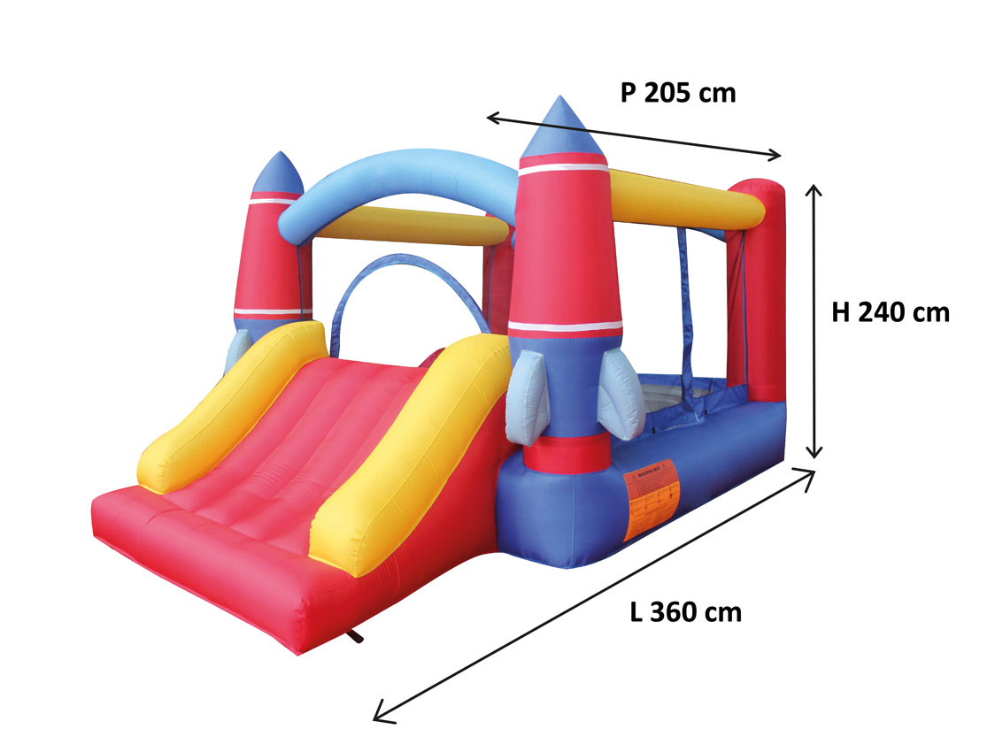 La château gonflable en fusée spatiale avec un souffleur offert fera le bonheur des enfants qui rêvent la tête dans les étoiles ! Avec sa belle zone de saut ce château gonflable permet à 4 enfants de jouer en même temps en toute sécurité. Lorsque la saison sera finie il faudra veiller à bien le sécher , le dégonfler et le ranger dans son sac de rangement . Caractéristiques : Château gonflable pour enfants de 3 à 8 ans Coloris : rouge/ jaune / bleu Une zone de saut avec toboggan large Sac de transport inclus Supporte un poids maximal de 180 kg Maximum 4 enfants en simultané Se fixe au sol grâce à six pattes de scellement. Montage simple et rapide Réservé exclusivement à usage familial en extérieur Dimensions : 360 x 240 x 205 cm Revêtement en nylon 420D et 840 D pour les zones de sauts Dimensions du carton : 42 x 43 x 55cm 1 souffleur 450 W /220V Poids : 20kg Notice de montage incluse Conforme aux normes EN71Produit réservé à un usage familial