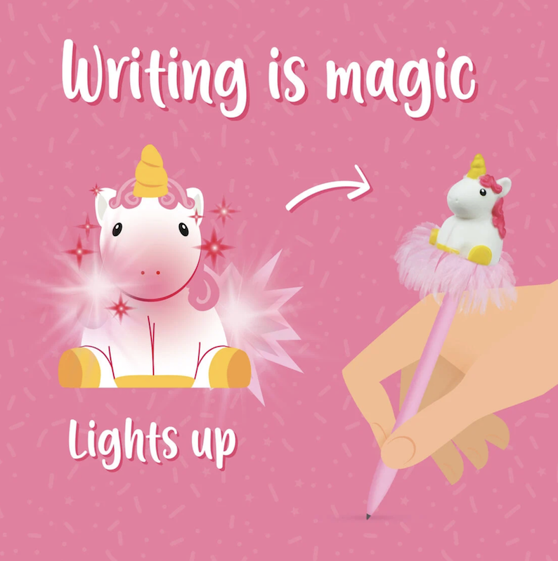 Writing is Magic Legami est le stylo surmonté d'une licorne lumineuse qui s'allume chaque fois qu'on la touche, faisant étinceler tous vos mots.