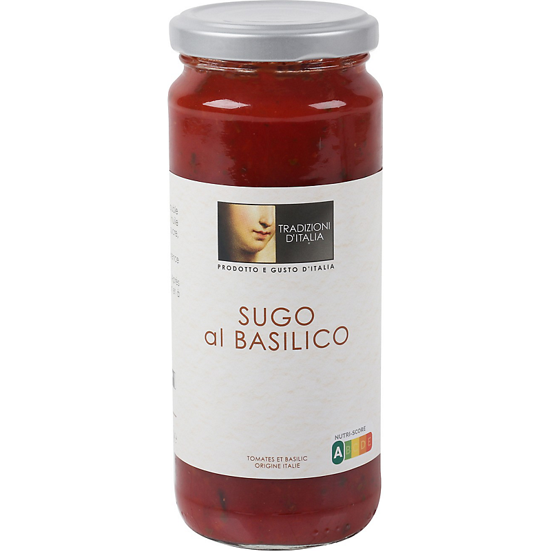 Ingrédients : Pulpe de tomates 71,3 %, double concentré de tomates 12 %, oignons 5 %, huile d'olive vierge extra, carottes, basilic 2 %, sel, céleri, arôme naturel de basilic.