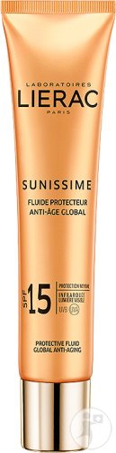 Lierac Sunissime Fluide Protecteur Anti-Âge Global SPF 15 40 ml est un fluide qui agit sur les signes de l'âge tout en protégeant votre peau des effets indésirables du soleil. Ce fluide agit contre les taches, les riches et le relâchement cutané tout en préservant votre peau du soleil grâce à ses principes actifs : - Système filtrant spectre global (SPF 15) : infrarouge, lumière visible, UVA/UVB, - Pro-taurine, - Acide-Hyaluronique, - Peptide Activateur de Bronzage. Sa formule hydrate ainsi votre peau et magnifie votre bronzage