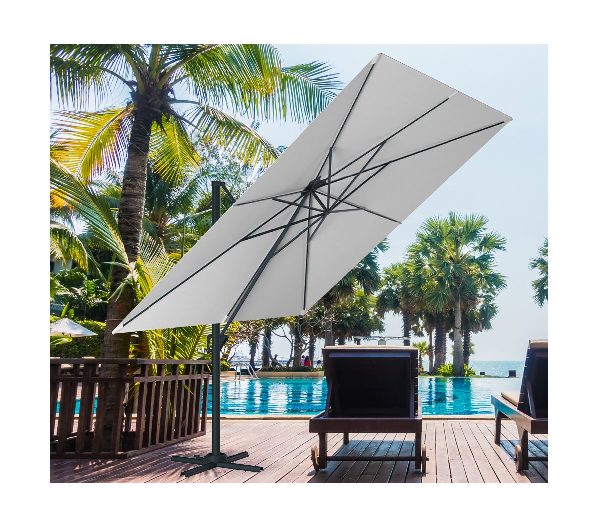 Composé de 8 baleines et d'un poteau 77x53mm ce parasol carré déporté dispose d'une rotation 360° et d'une inclinaison verticale pour vous protéger des rayons UV tout au long de la journée.