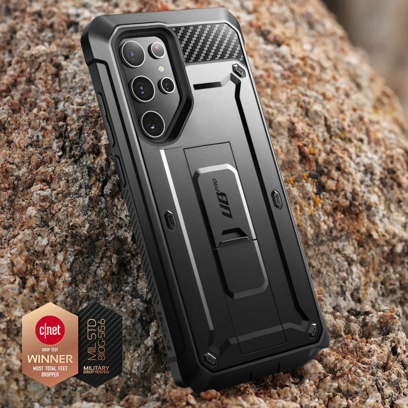 Coque intégrale Supcase Unicorn Beetle Pro pour Samsung Galaxy S24 Ultra. Multicouche : polycarbonate + silicone gel. Bord caméra surélevé. Anti-chutes : 1.2m de hauteur. Fonction support. Grips antidérapants. Fonctions accessibles, boutons redessinés.