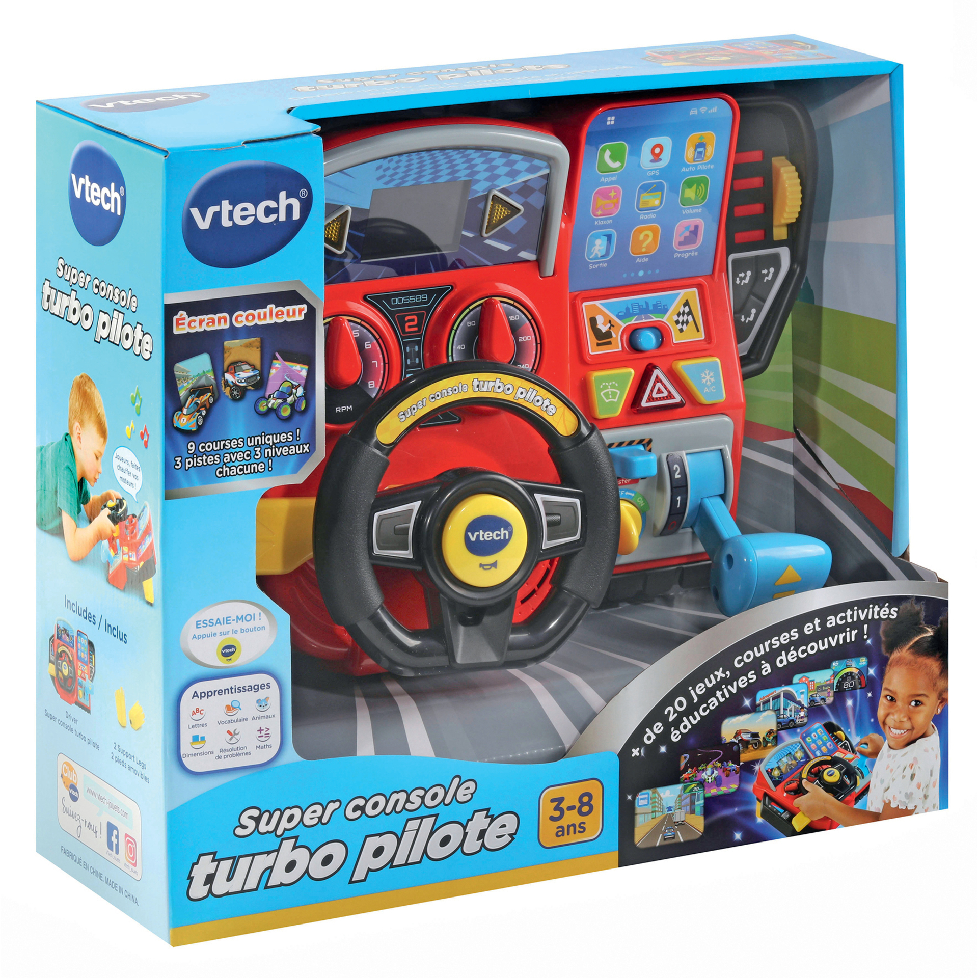 Super console turbo pilote - 3 - 8 ans Une console idéale pour devenir un vrai pilote ! Différents éléments réalistes : un volant, un Klaxon, un clignotant, un levier de vitesses, un warning… tout pour bien s’amuser en imitant les plus grands ! 3 modes de jeu sont inclus : Apprentissages avec différentes missions, Course avec 3 circuits différents et Jeu libre avec la reproduction d’une vraie situation de conduite autour de différents lieux où l’enfant doit conduire ses amis virtuels. Les 20 jeux inclus permettent à l’enfant de faire le plein d’apprentissages : chiffres, calcul, additions et soustractions, résolution de problèmes, alphabet, phonétique, couleurs et animaux. Le bouton Turbo permet de faire accélérer la voiture dans les jeux. 12 applications et fonctionnalités sont présentes sur le tableau de bord et viennent déclencher des interactions sur l’écran : téléphone, vitesse, GPS, musique, radio, niveau d’essence, détecteur de ceinture, clim, pression des pneus, dégivrage, réglage du volume sonore ainsi que réglage des feux. Ecran couleur LCD de 2,4" - Volant pour naviguer – Klaxon pour sélectionner l’activité. 19 chansons et 6 mélodies. Arrêt automatique et réglage du volume sonore. Boîte Try-me. Fonctionne avec 2 piles LR6 fournies.
