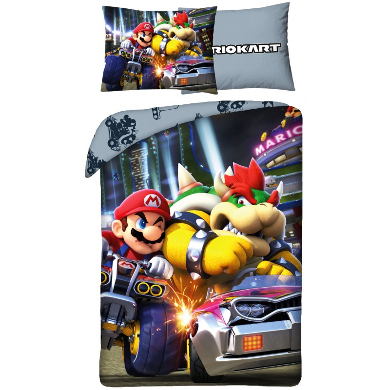 Super Mario - Parure de Lit Enfant Coton Kart Bowser - Housse de Couette 140x200 cm Taie