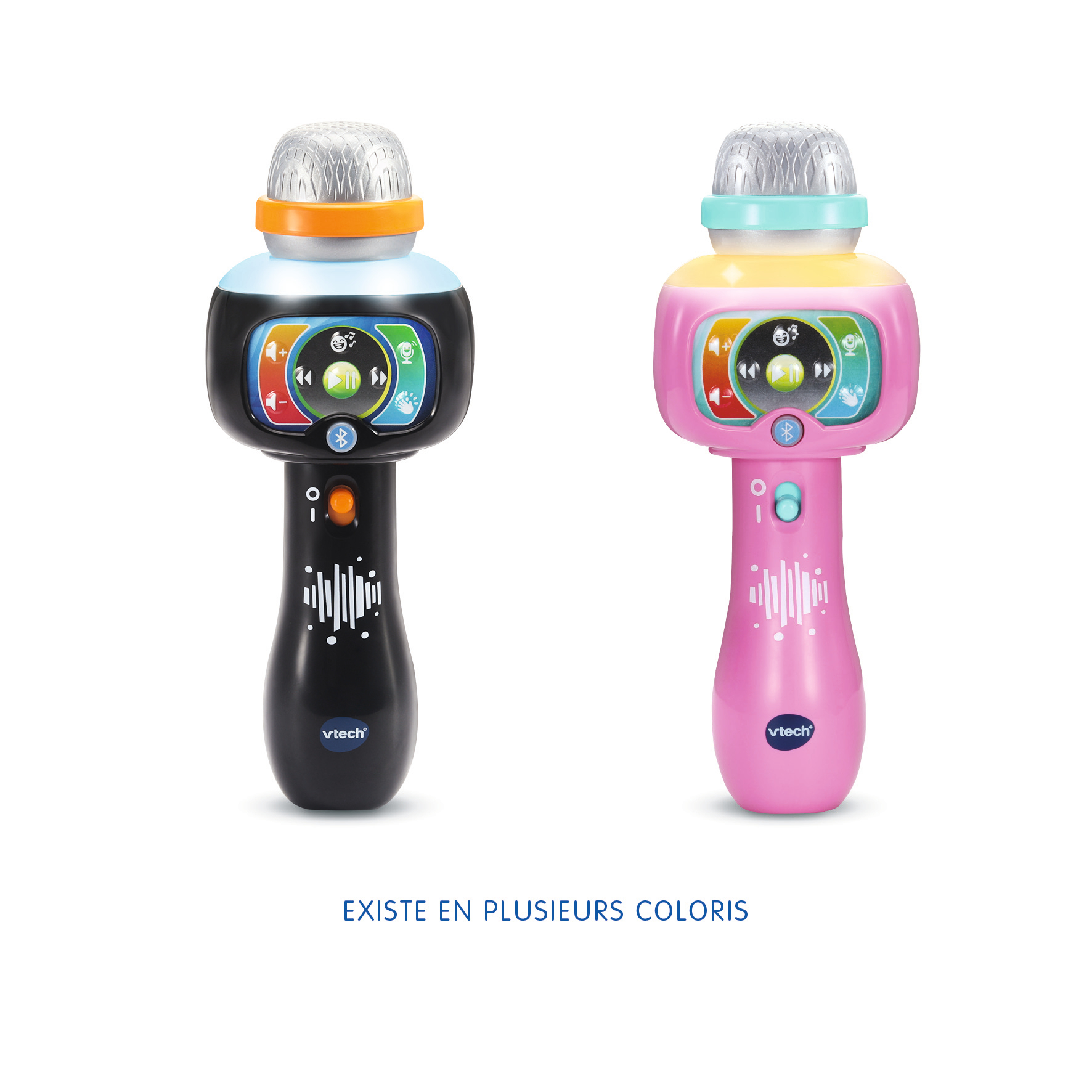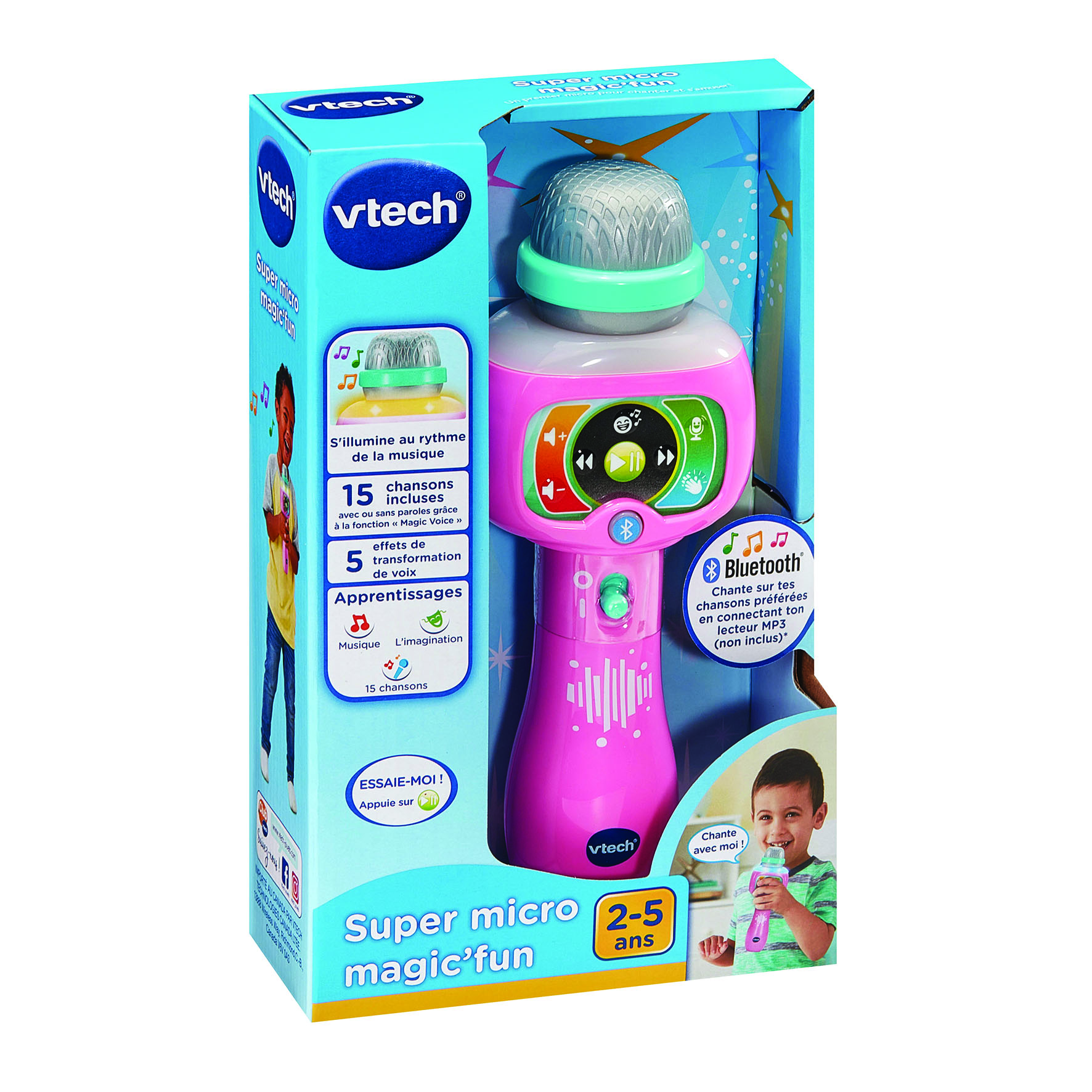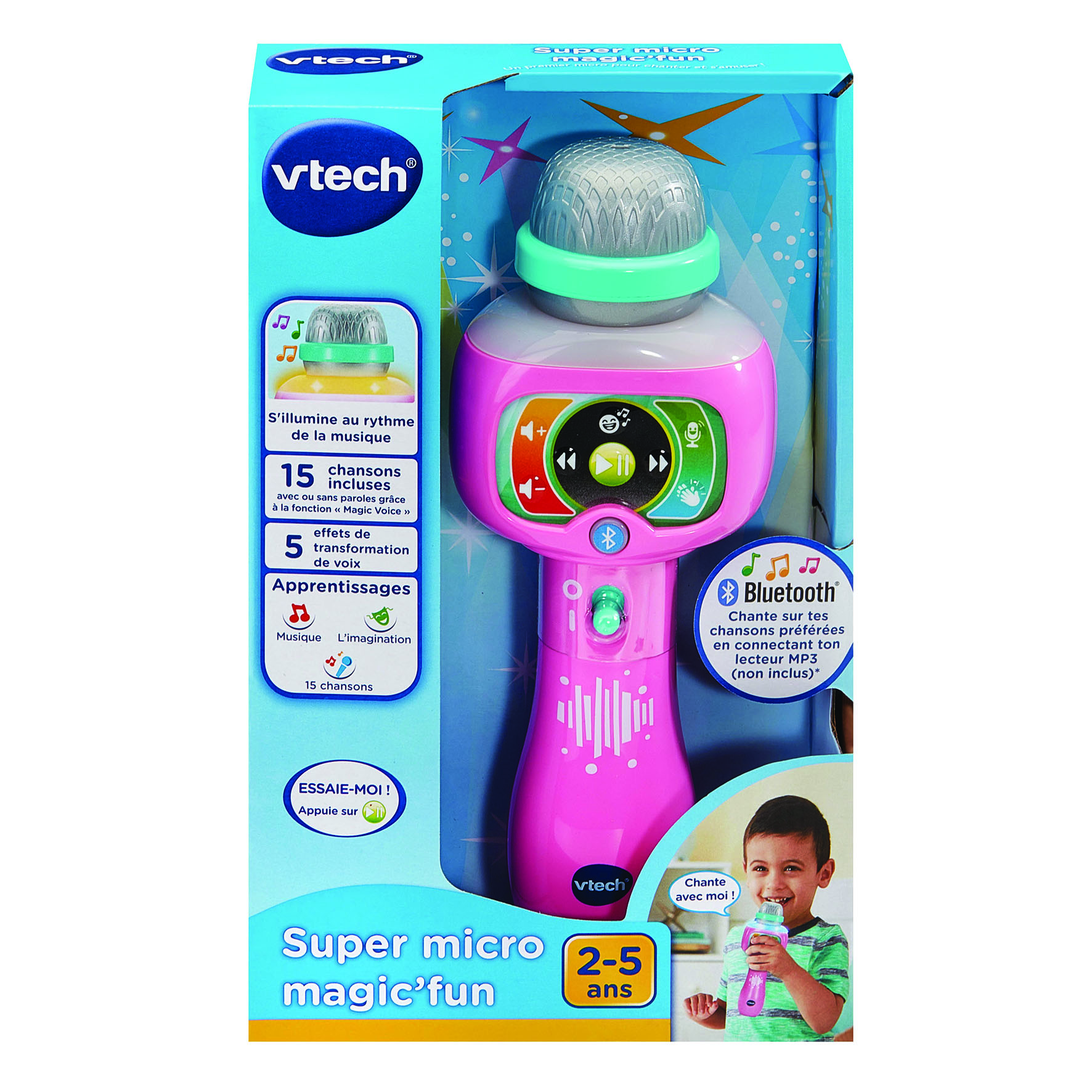 Super micro magic'fun rose - 2 - 5 ans Un premier micro pour chanter et s'amuser ! L'enfant devient la star de son propre concert ! Il peut chanter et s'amuser à transformer sa voix sur les 15 chansons du micro. Grâce au bouton "magic voice", il peut effacer les paroles et chanter seul. Il peut aussi chanter sur ses chansons préférées en connectant un lecteur MP3 (non inclus) en Bluetooth®. La connexion est sécurisée par code. De nombreux effets supplémentaires : - Applaudissements - Musique : pour ajuster le volume sonore et utiliser des effets de transformation de la voix - Effets lumineux : le micro s'illumine et change de couleur au rythme de la musique ou de la voix Boîte try-me. Fonctionne avec 3 piles LR03 fournies.