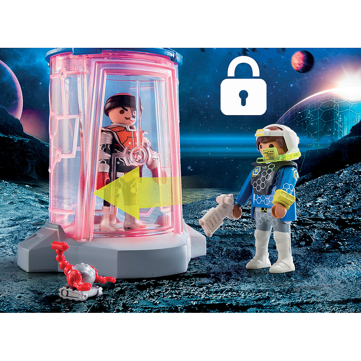 Les agents de l'espace n'en finissent pas de traquer les bandits. Avec cellule de prison équipée de détecteurs lumineux anti-évasion. Le module déclairage à LED sallume (nécessite 2 piles AAA 1,5 V non fournies) lorsque la porte de la cellule est fermée.