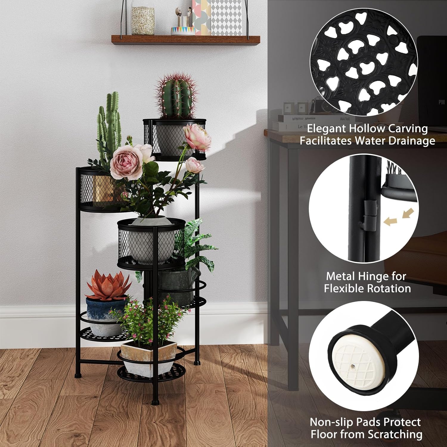 - Conception pliable et rotative : Le support de pot de fleurs contient 3 supports, reliés par des charnières solides pour un réglage personnalisé. Les supports de plante peuvent être ajustés à différents angles selon les besoins. Vous pouvez encore le plier en une taille compacte pour un rangement pratique.