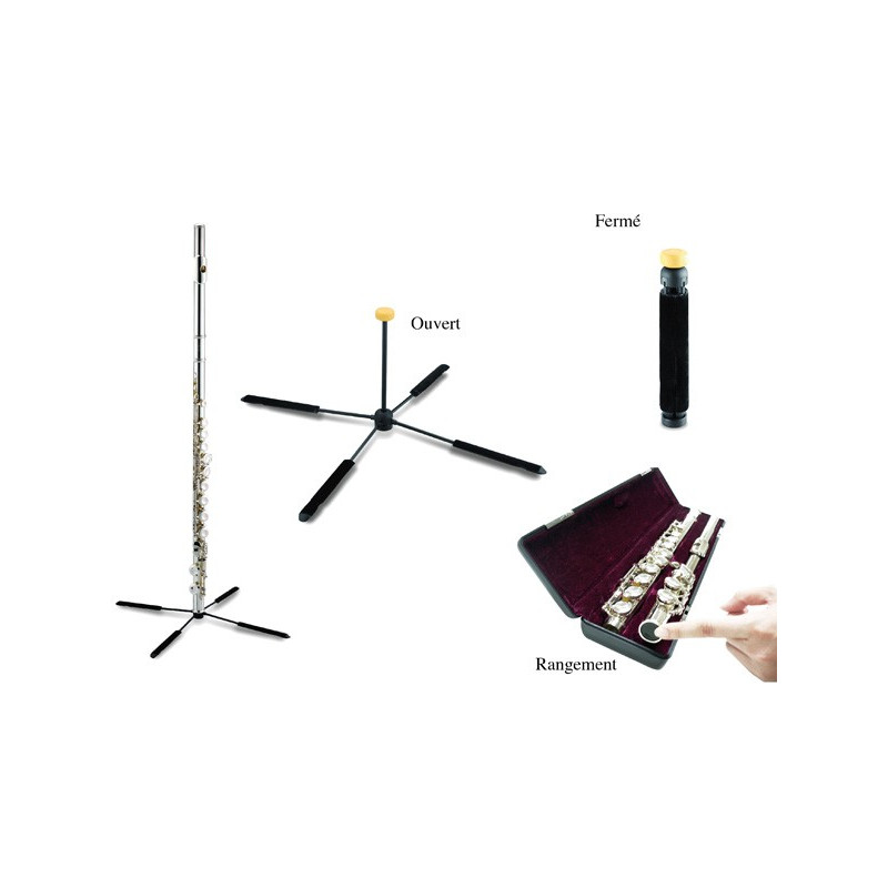 Support flûte repliable ultra-compact, se range dans la patte de l’instrument (hauteur : 14.8 cm, poids : 0.1 kg, diamètre base : 16.5 cm, taille replié : 12.8 x 1.9 cm).