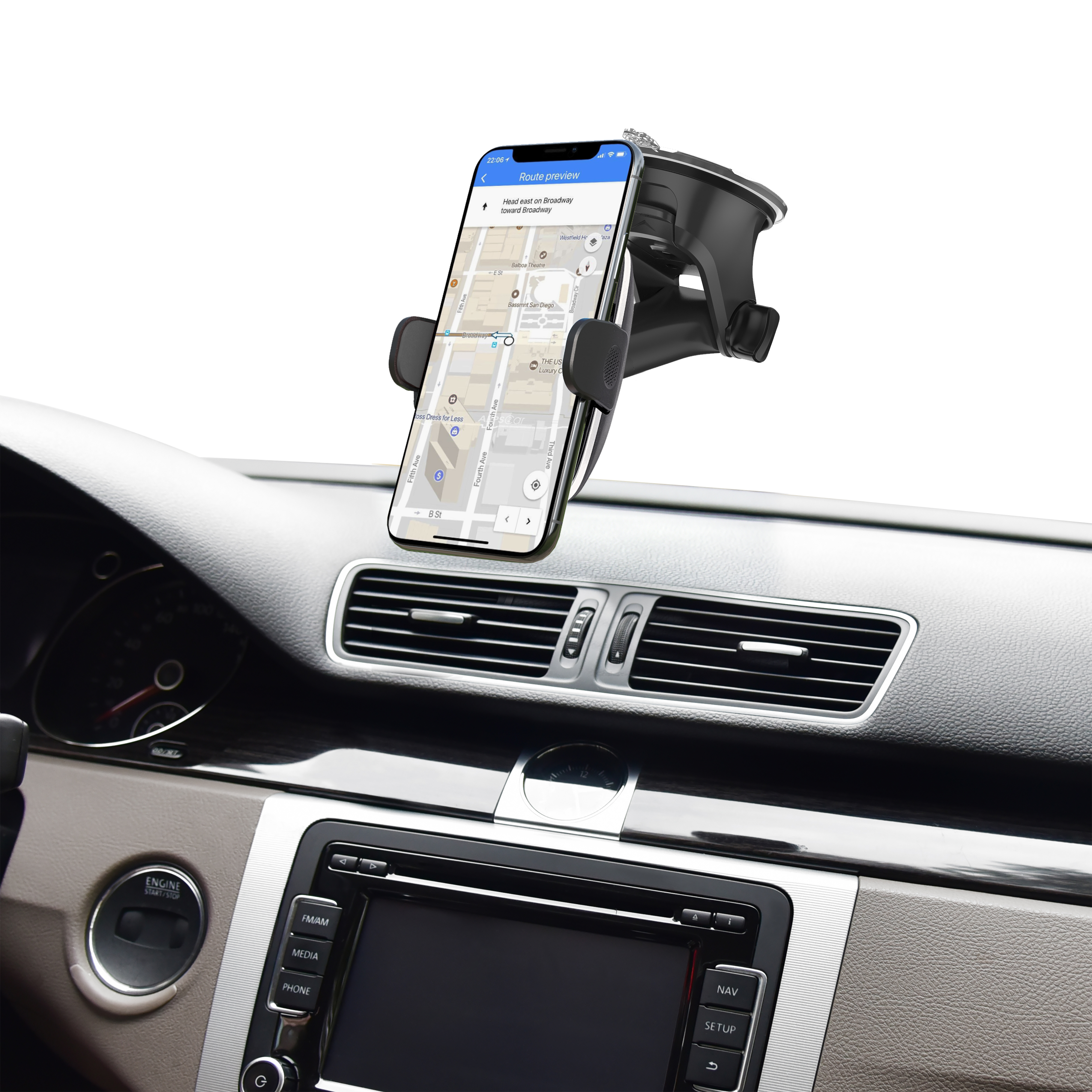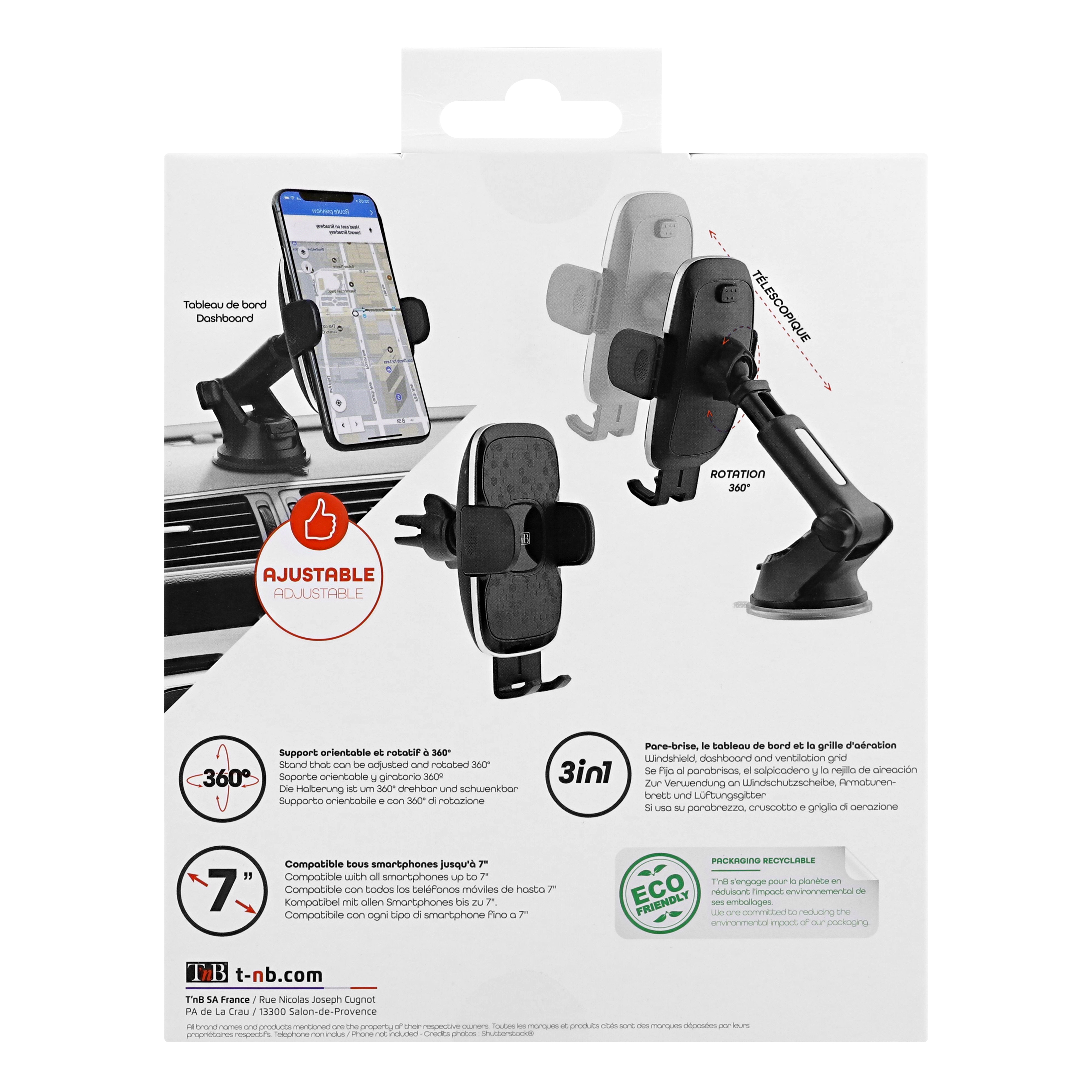 Ce support premium pour pare-brise, tableau de bord et grille d'aération est idéal pour accéder à votre smartphone en un geste en voiture. Sa mâchoire ultra-stable et ajustable maintiendra au mieux votre smartphone ! Il dispose d'une tête rotative à 360° et s’adapte à tous les véhicules grâce à son système de fixation 3 en 1. De plus, son bras télescopique ajustable à 180° est équipé d'un roulement mécanique qui vous permettra d'ajuster sa distance d'utilisation. Sa ventouse adhésive dernière génération assure un maintien de votre Smartphone sans pareil. Le produit est compatible avec tous les smartphones jusqu'à 7 pouces.