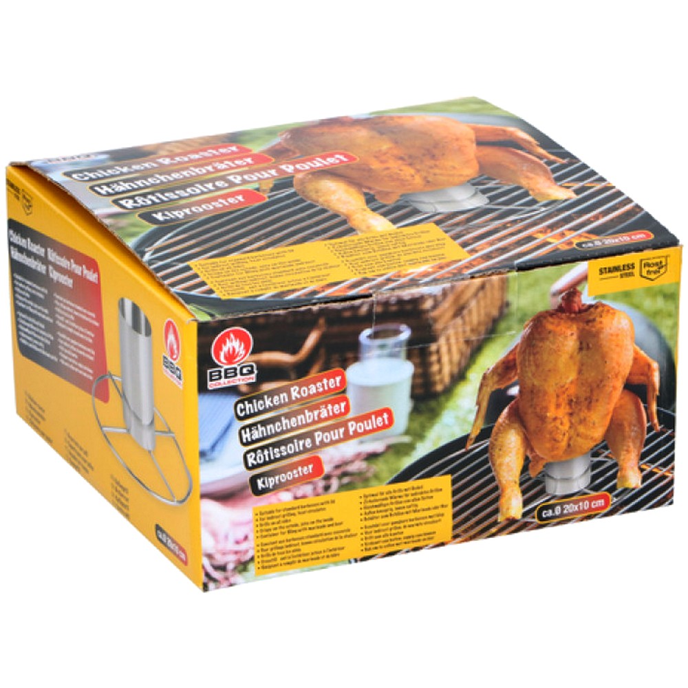 Voici l'accessoire qui vous fera aimer la volaille cuite au grill . Préparez votre poulet avec votre marinade préférée et posez le sur le support Il ne vous reste plus qu a déposer votre volaille sur votre barbecue de jardin ou dans votre four. Pour apporter plus de moelleux à la viande , ajoutez de l'eau ou de la bière dans le récipient au centre. - Dimensions (ØxH) : 20 x 10 cm - Matériaux : Inox