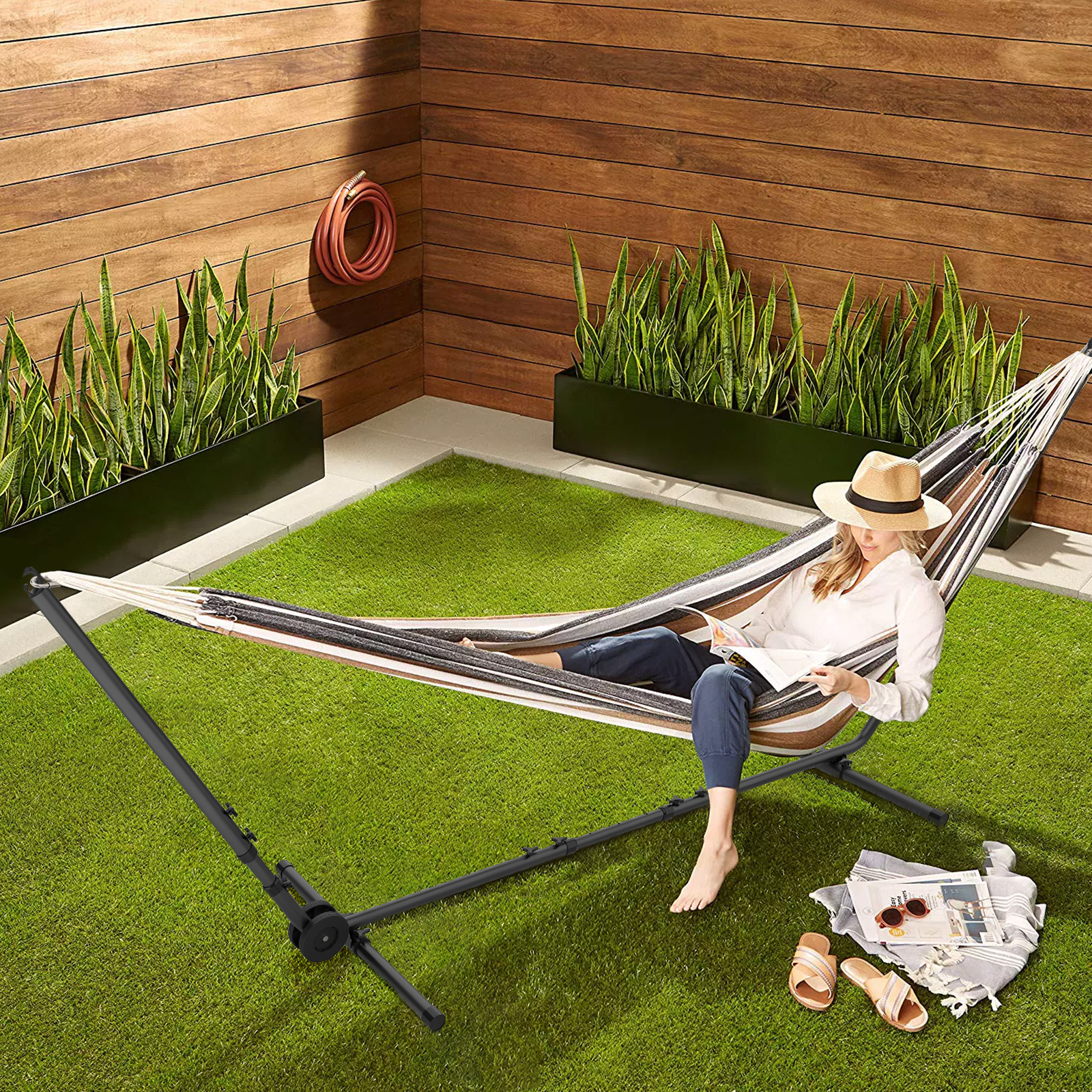 Vous pensez utiliser votre temps libre pour vous détendre dans votre jardin en profitant de la belle journée ensoleillée allongée sur votre hamac? Cet article durable et facile à assembler fait partie intégrante de ce décor pour transformer votre jardin en paradis. Ce support de hamac est compatible avec la plupart des hamacs, vous permettant de vous détendre dès que vous le désirez. Polyvalent, ce support durable convient parfaitement à tous les paysages. Ne manquez pas la chance de go?ter au sentiment de vacances dès que bon vous semble. Caractéristiques techniques: Accessoires: Hamac non inclus Dimensions: 296-380 x 107-132 x 100 cm Charge maximale: 150 kg Matériau: Polyester, Acier avec revêtement en poudre Poids: 14,5 kg Taille de hamac adaptée: 290 - 390 cm Poids et dimensions du colis: Poids: 15.0 kg Dimensions: 101.0*30.5*14.0 cm Modèle: Accessoires: avec roues et sac de transport Caractéristiques les plus appréciées: Parfaitement adapté pour vos décorations intérieures ou extérieures, vous pourrez profiter de votre temps de lecture, sieste, bains de soleil, etc. en toute détente Définir la hauteur de la position désirée selon vos besoins Le support très pratique vous permet d'accrocher votre hamac dans des espaces ouverts et où vous voulez Ce hamac amovible est portable, idéal pour les activités en plein air comme le camping, les voyages, la randonnée et les pique-niques Profitez de votre sieste grace au support stable, durable et extrêmement s?r Une stabilité accrue est assurée grace à ses pieds anti-dérapants Les anneaux de suspension fournis fixent solidement le hamac sur le support Facile à installer Contenu du colis: 1 x Support pour Hamac de Jardin Camping