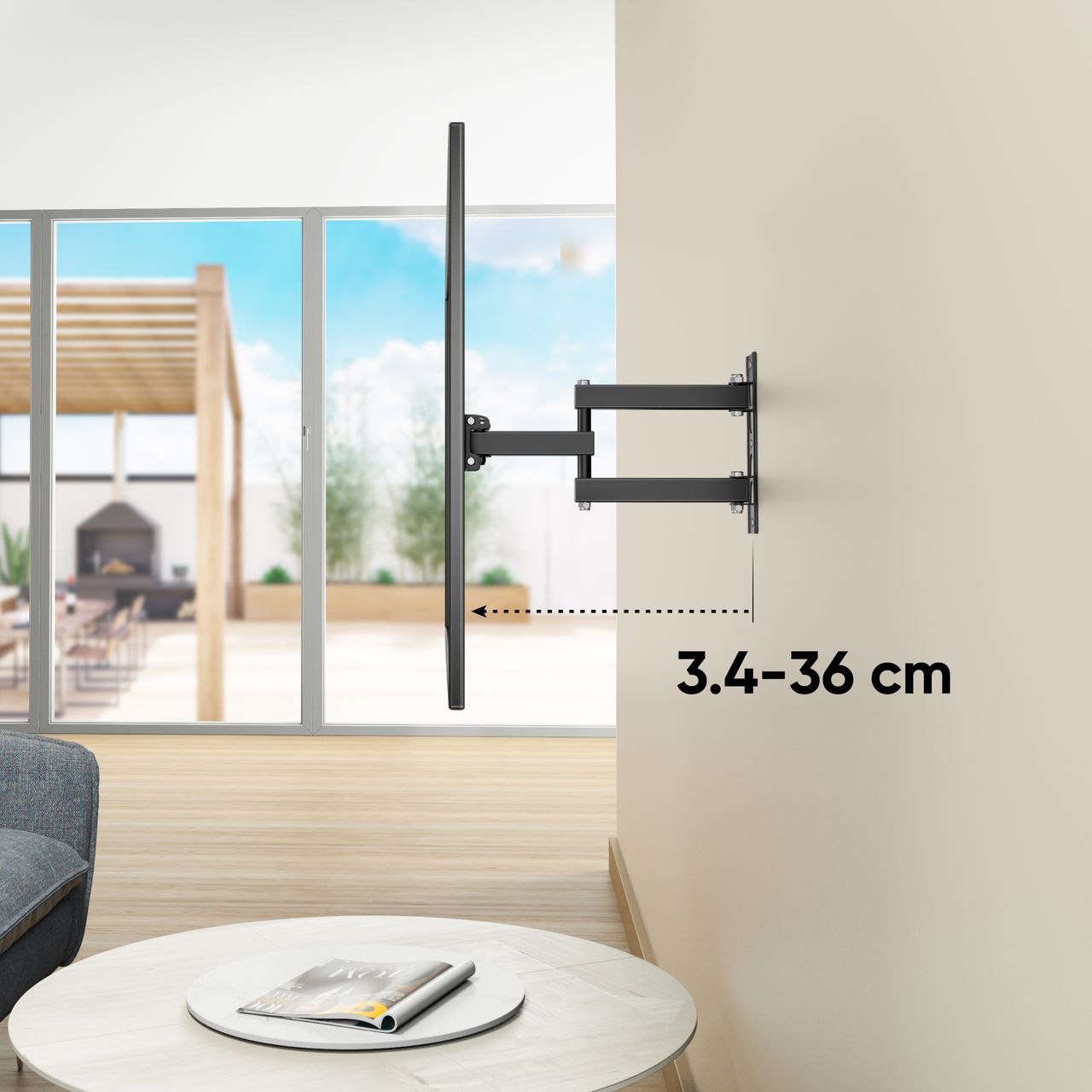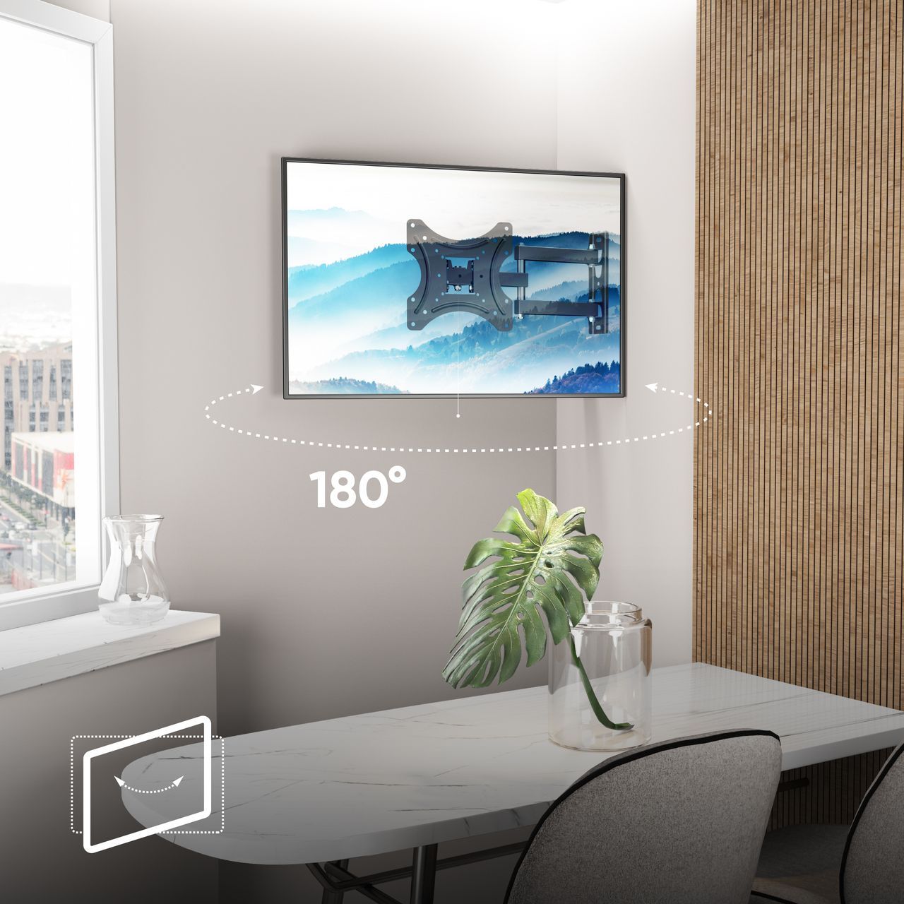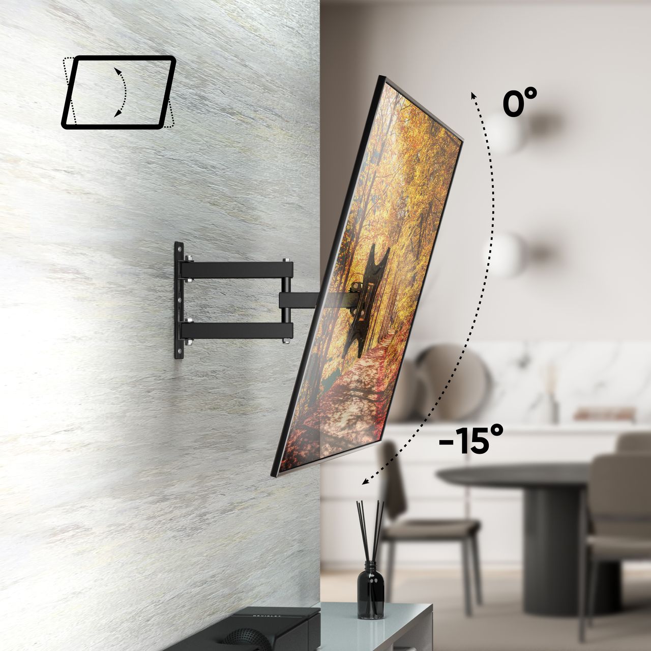 FIXATION TELEVISION MURALE | Accroche TV mural pivotant peut être tourné de 180° | L'angle d'inclinaison du support TV mural inclinable peut atteindre 15° | La portée entre le mur et le support tele mural pivotant peut être réglée de 34 - 360 mm | Réglage flexible du support mural télé vous permet de positionner l'ecran à votre discrétion