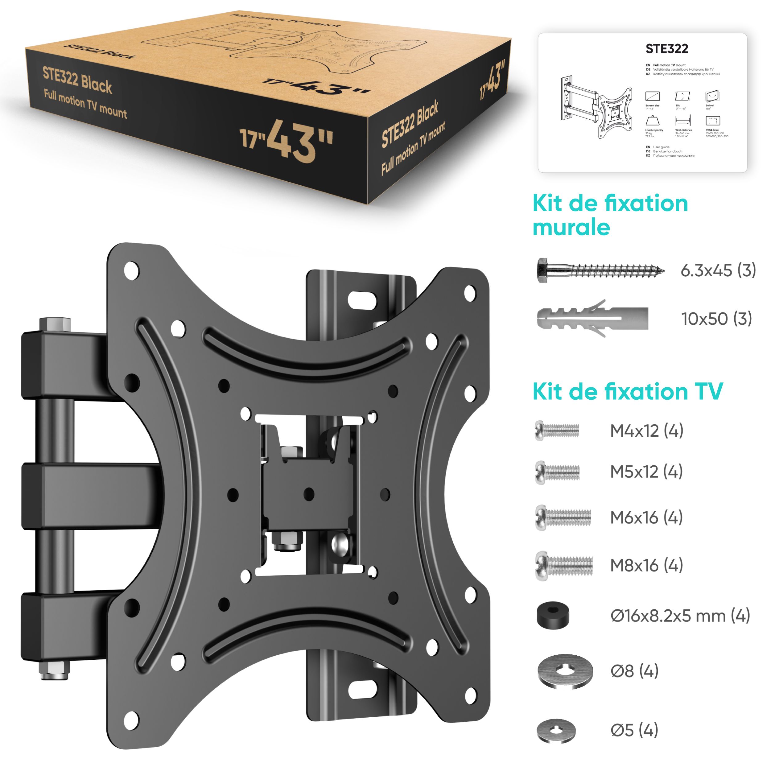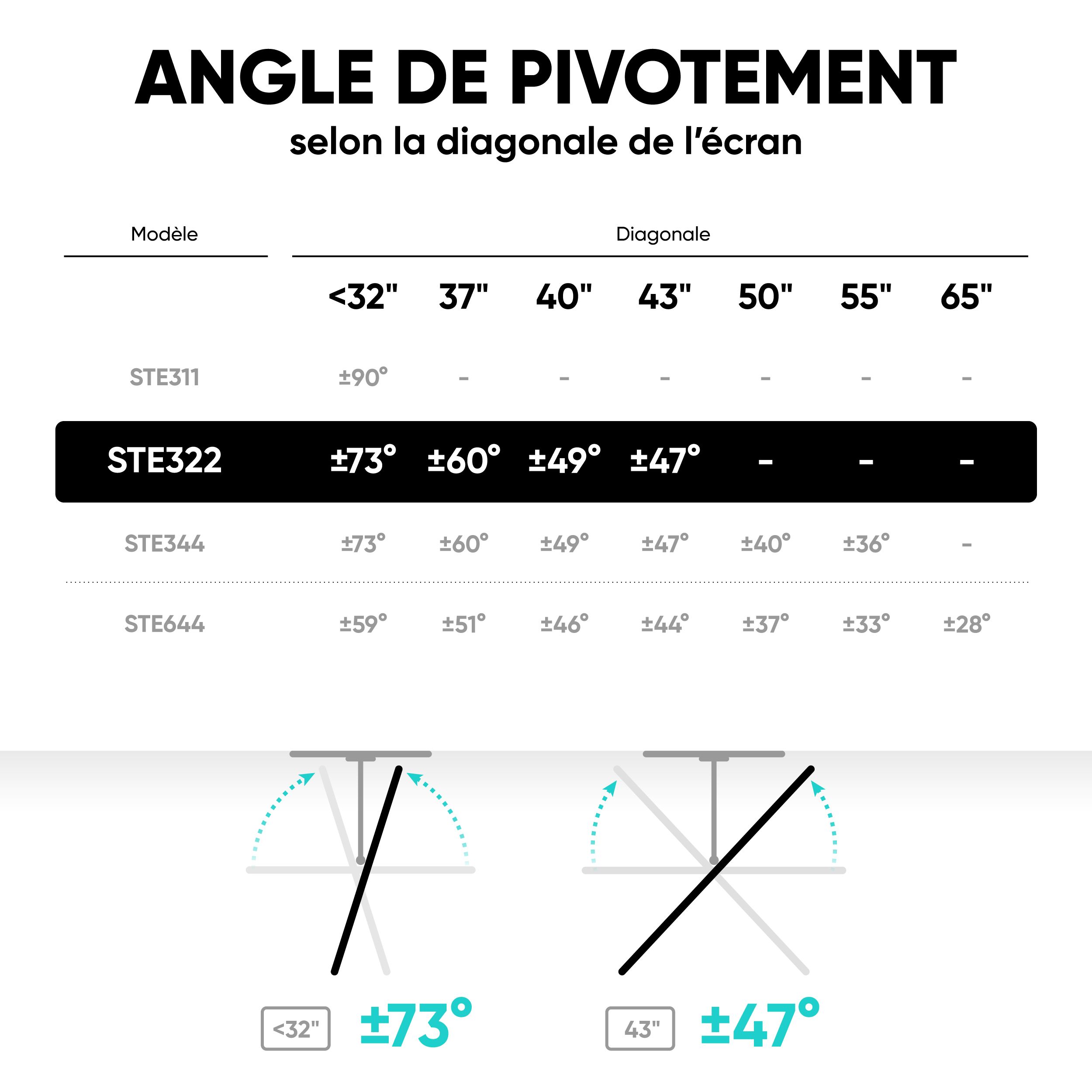 Support TV 17"-43", 35 kg max, VESA 75x75-200x200, Inclinable, Pivotant, STE322-B Noir