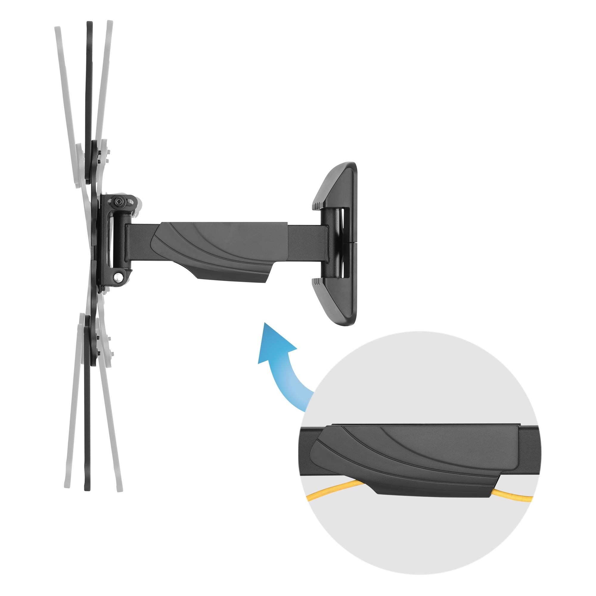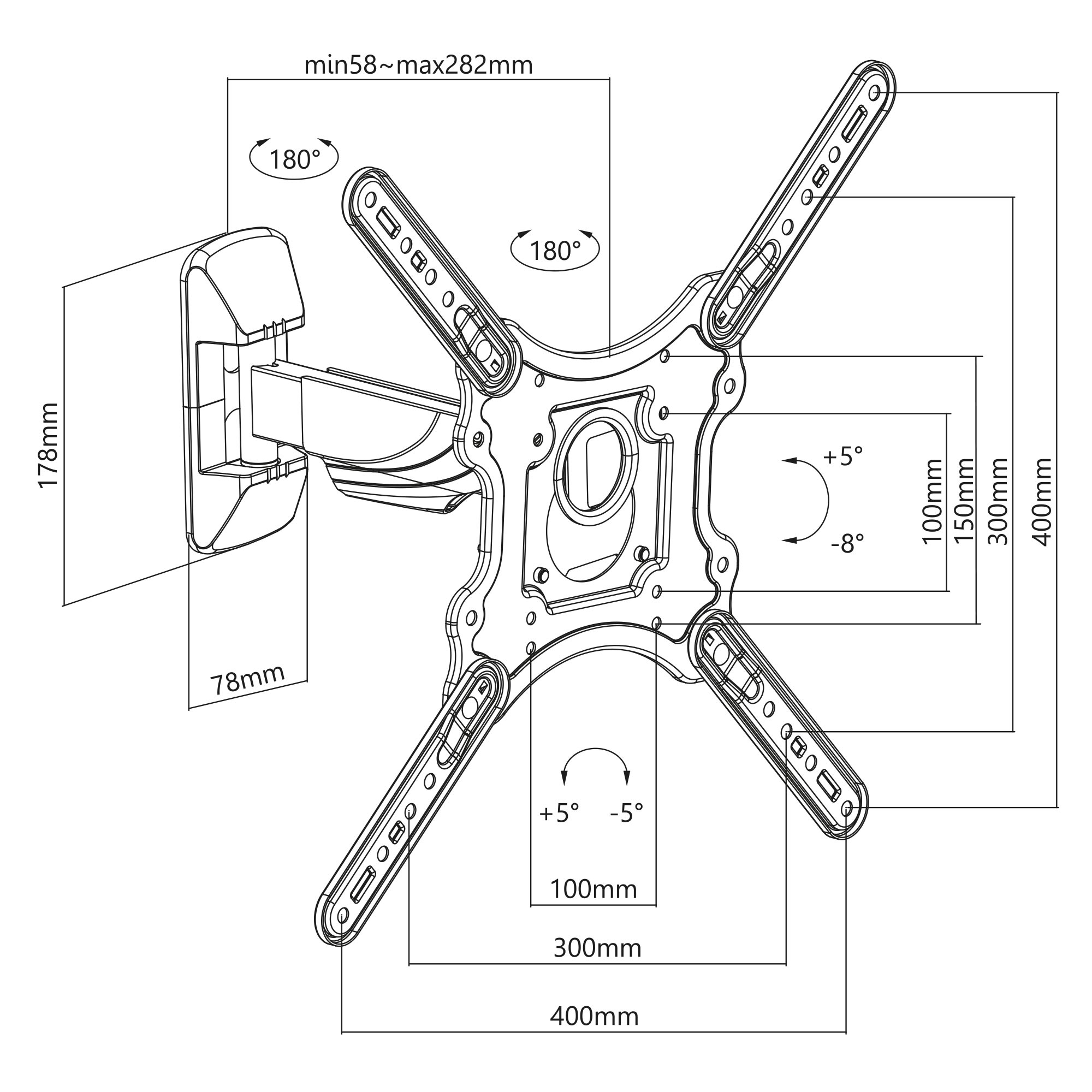 Support TV mural extensible moderne adapté aux téléviseurs de 23 à 55 pouces ! Avec ce support mural, tu peux régler ton téléviseur comme tu le souhaites. Pour le pivotement, tu disposes de deux articulations qui peuvent pivoter de 180°. En même temps, tu peux allonger le téléviseur jusqu'à 28,2 cm. Le support peut être incliné de +5° à -8°. Les normes VESA de 100x100 mm, 300x300 mm et 400x400 mm sont disponibles pour la fixation.