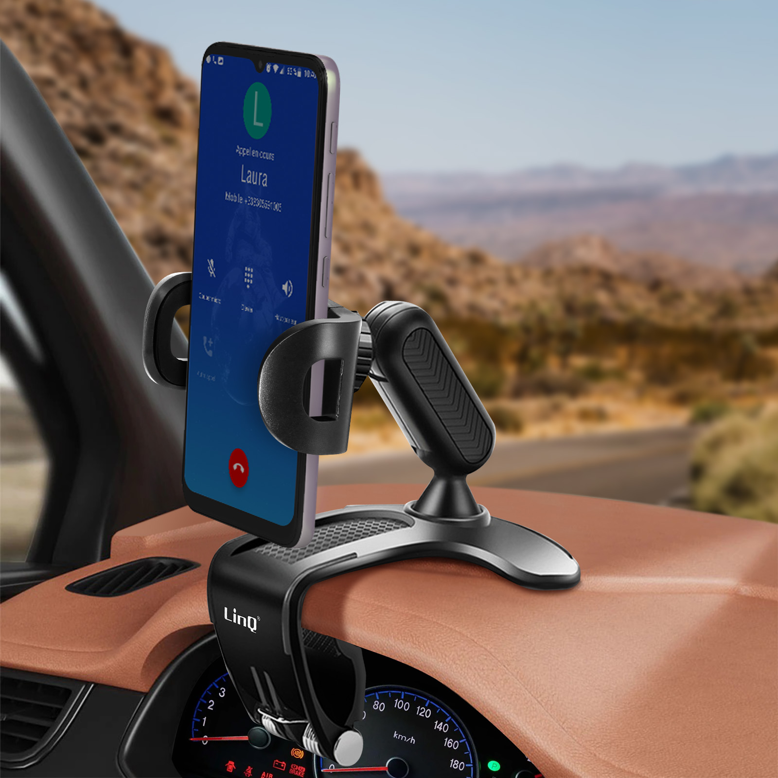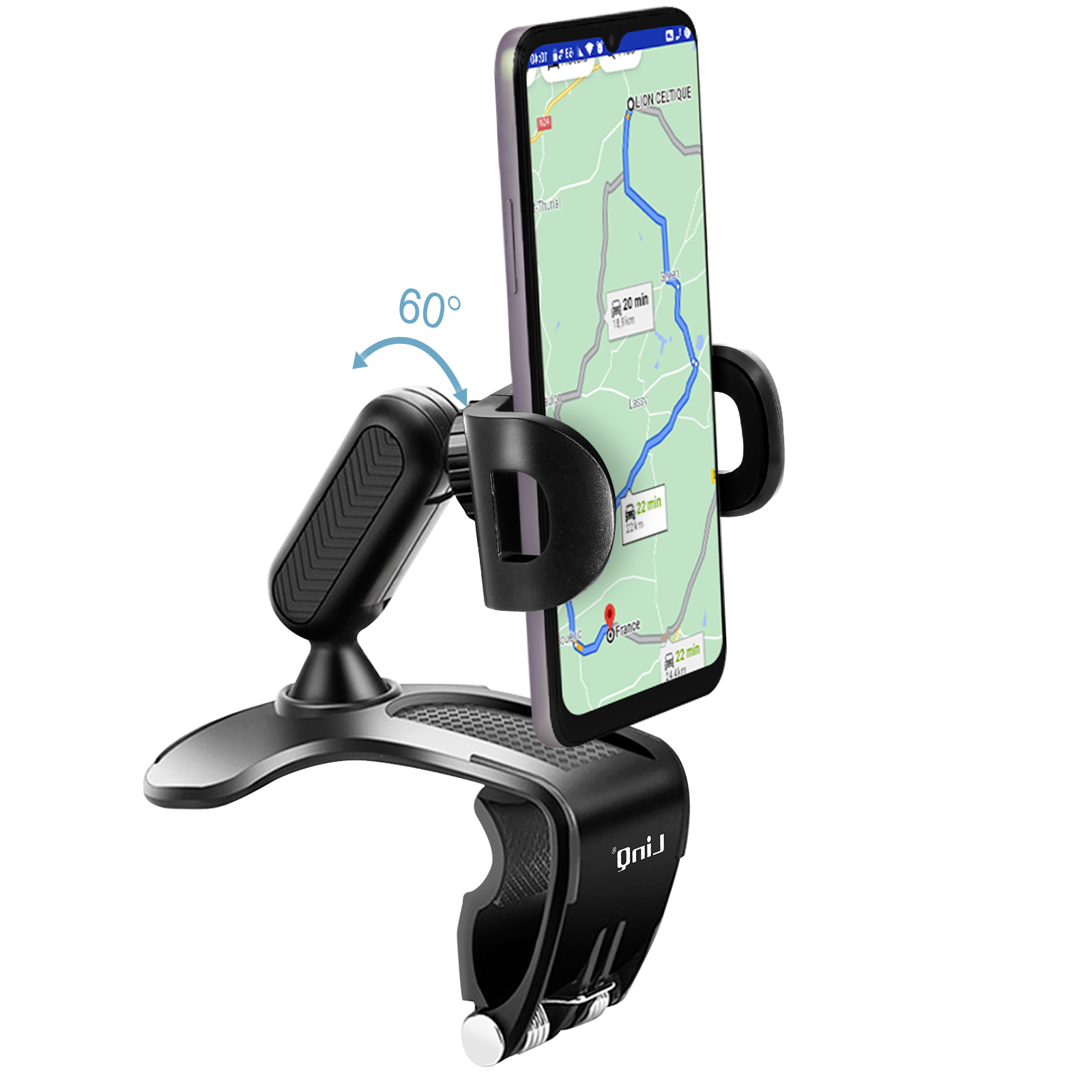 Support Voiture Smartphone de LinQ. Permettant d'utiliser votre mobile sur la route. Fixation sur tableau de bord. Pince en forme d'arc avec surface antidérapante. Support ultra-stable. Rotatif à 360°. Angle d'inclinaison réglable à 60°.