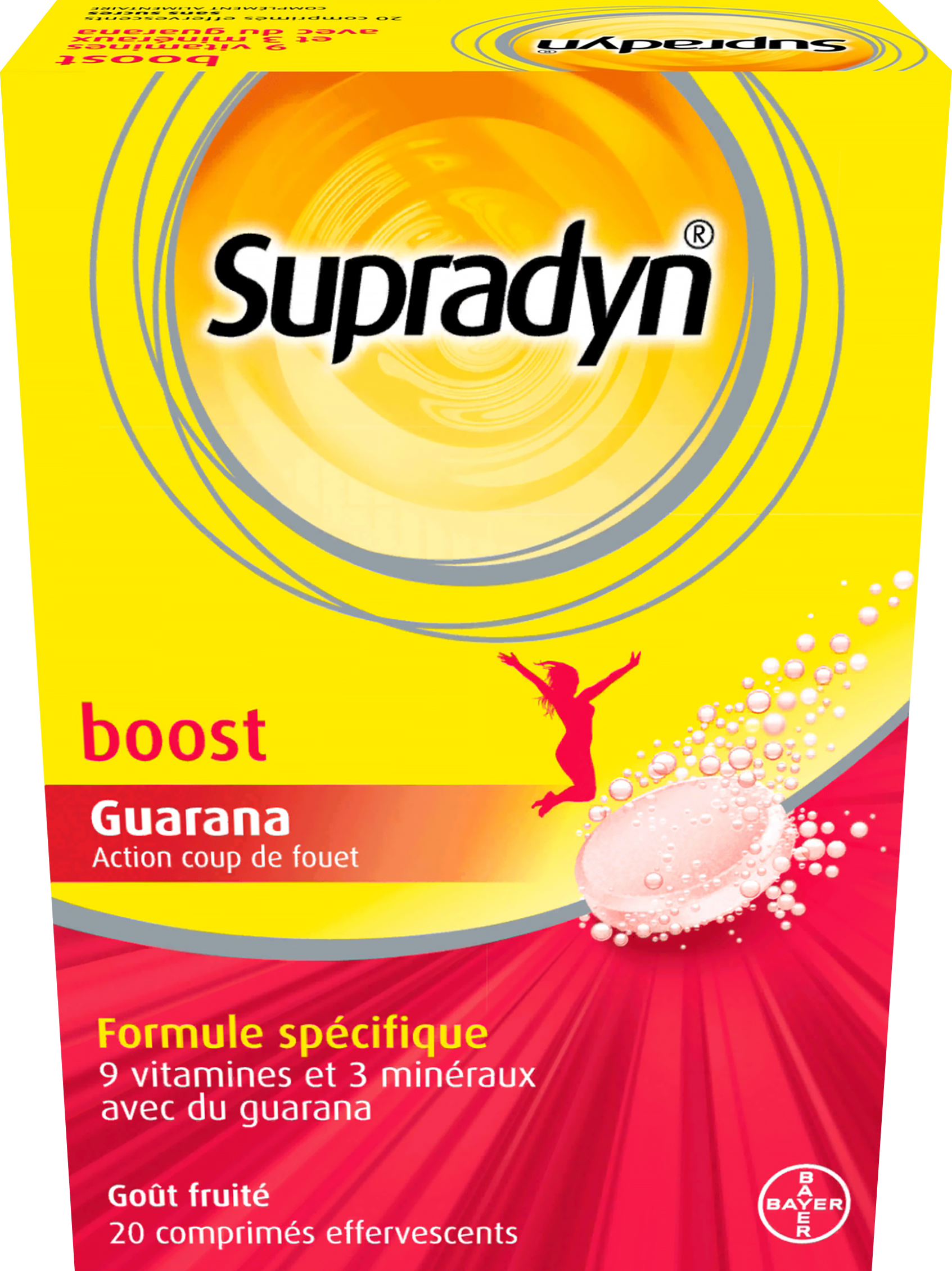 Supradyn Boost donne un coup de fouet à mon énergie grâce au guarana qu’il contient. Le guarana contribue à supprimer la fatigue, Entre vie professionnelle soutenue, activités sportives intenses et vie sociale active (fêtes, restaurant…), vous manquez parfois d'énergie et de concentration ; votre journée peut vous semblez interminable. Conscient qu'il vous est impossible de ralentir votre rythme, il vous faut un "" boost "" d'énergie pour tenir tout au long de la journée. Grâce à sa formule unique composée de guarana, de vitamines B et C, de zinc et de magnésium, Supradyn Boost vous permet : - de retrouver votre énergie physique et intellectuelle, - et de stimuler votre concentration. Un comprimé suffit à vous remettre d'aplomb pour la journée !