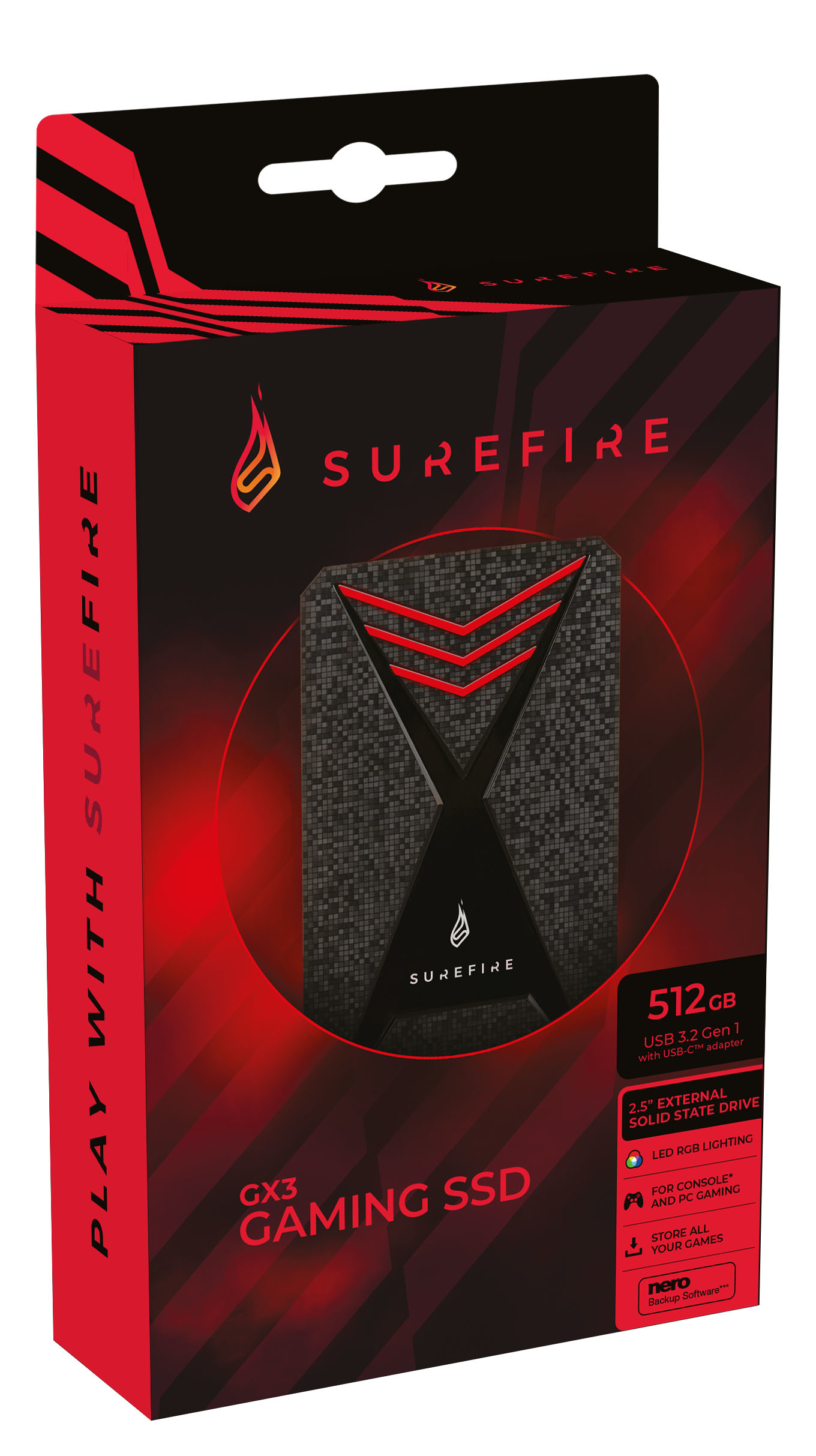 Le SSD « gaming » SureFire est doté d’une mémoire flash haute vitesse et d’une interface USB 3.2 Gen.1 pour des vitesses de transfert allant jusqu’à 5 Go/s. Optimisé pour une performance inégalée, il permet de réduire le temps de sauvegarde des jeux de manière significative. Le SSD est accompagné d’un adaptateur USB-C™ pour pouvoir être utilisé avec une multitude d’appareils. Les SSD ne comportent aucune pièce mobile. Ainsi, ils sont plus rapides, plus fiables, silencieux et consomment moins d'énergie !