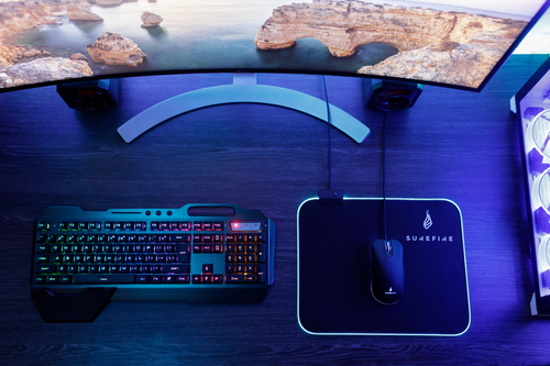 Le tapis de souris gamer Silent Flight RGB-320 de SureFire est doté de bords éclairés par des LED RVB qui peuvent être réglés à la perfection pour ta configuration de jeu.