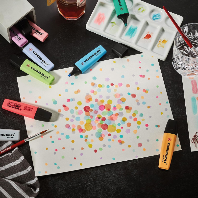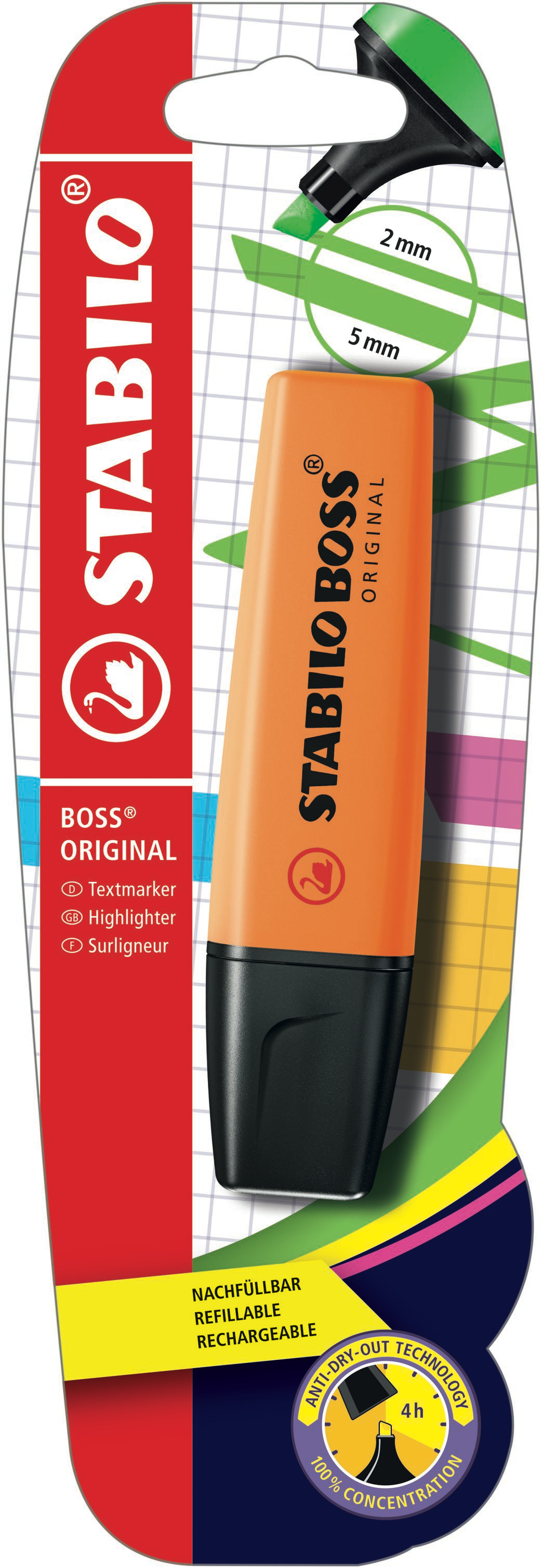 Décliné en 9 couleurs fluo intenses, STABILO BOSS ORIGINAL est le surligneur incontournable pour se concentrer sur les informations essentielles à l'école comme au bureau depuis 1971 alliant qualité et performance. STABILO BOSS ORIGINAL peut rester ouvert jusqu'à 4 h sans sécher grâce à son procédé anti-dessèchement. Sa pointe biseautée permet 2 largeurs de tracé (2 et 5 mm) pour surligner avec un trait épais ou souligner avec un trait plus fin vos documents au travail comme à la maison. Idéal également pour ombrer, encadrer, décorer vos projets et pour vos loisirs créatifs tels que le lettering, le bullet journal,... Il offre une capacité de 350 m de surlignage et son encre universelle à base d'eau diffuse une couleur fluo intense tout au long de son utilisation. Fabriqué en Allemagne, le surligneur STABILO BOSS ORIGINAL peut être rechargé facilement avec la recharge STABILO lorsqu'il est vide.